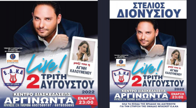Ο Στελιος Διονυσίου, ένας καλλιτέχνης με σπουδαία πορεία και όνομα βαρύ σαν ιστορία την Τρίτη 2 Αυγούστου θα είναι στο κέντρο διασκέδασης Αργινώντα για μια αυθεντική λαϊκή βραδιά!!! Σας περιμένουμε όλους!!!