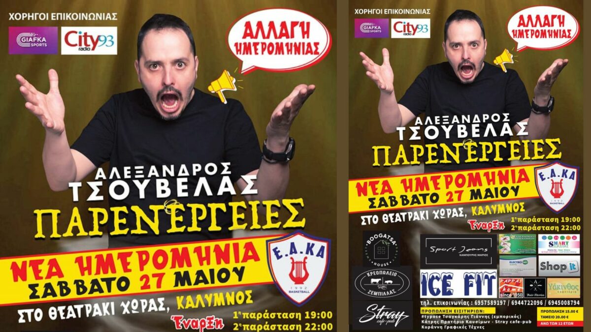 Στις 27 Μαΐου θα είναι στην Κάλυμνο για τις παραστάσεις που έχει προγραμματίσει ο Αλέξανδρος Τσουβέλας όπως ανακοίνωσε η ομάδα της Ε.Α.ΚΑ.