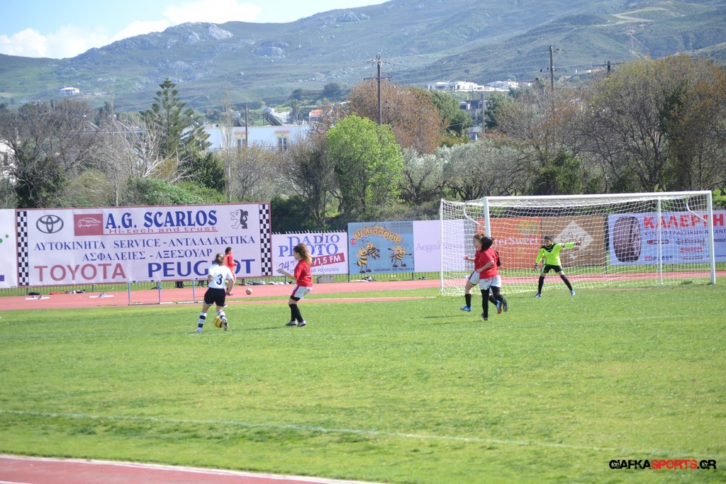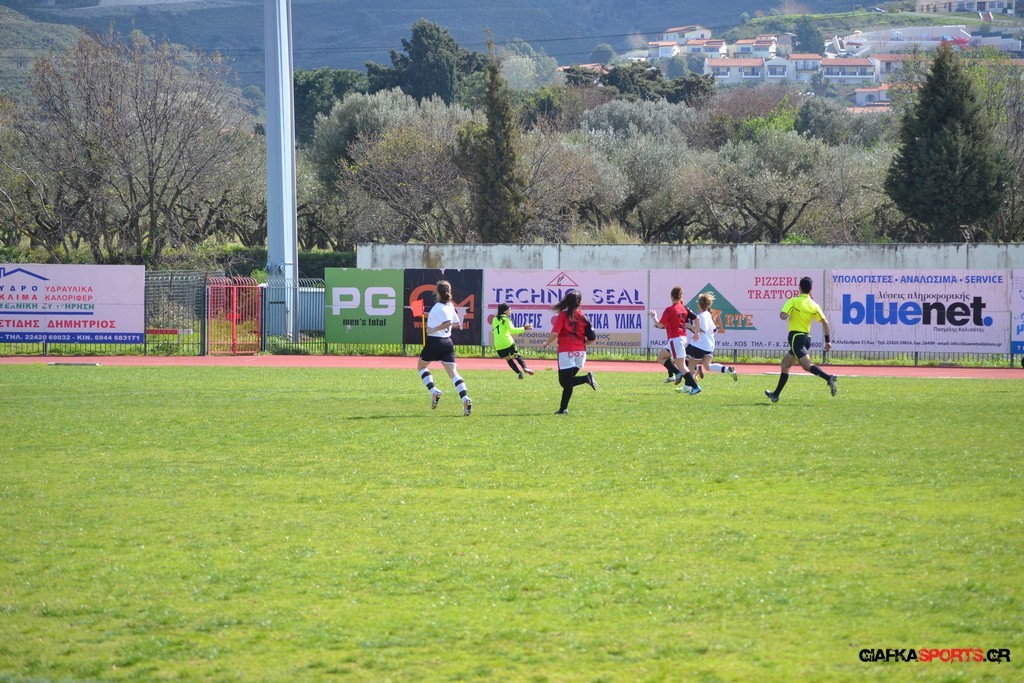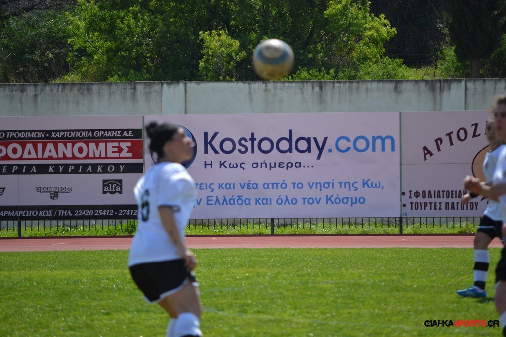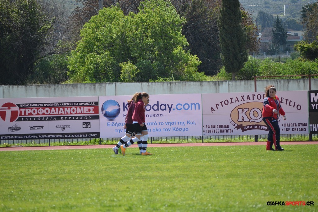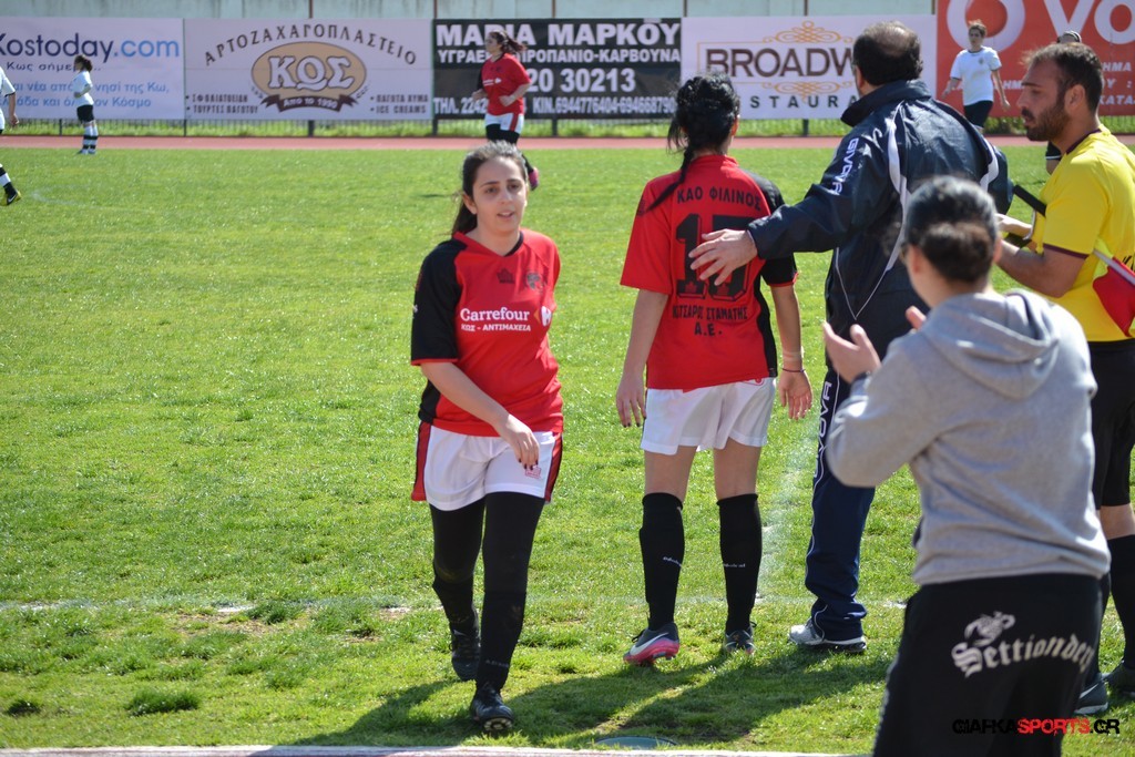 Το δωδεκανησιακό ντέρμπι ανάμεσα στον Φιλίνος και τον Α.Σ.Τ.Ι.Ρ. ξεκίνησε με τις φιλοξενούμενες να πιέζουν από την αρχή του παιχνιδιού και να καταφέρνουν μόλις στο 9′ να προηγηθούν στο σκορ,όταν η Μιχαλοπούλου μπήκε στην περιοχή,ανατράπηκε από την Σταμόγλου και τον Ωραιόπουλο να δείχνει το σημείο του πενάλτι.Την εκτέλεση ανέλαβε η Χέλστρομ στέλνοντας την μπάλα στην δεξιά γωνία του Φιλίνος για το 0-1.