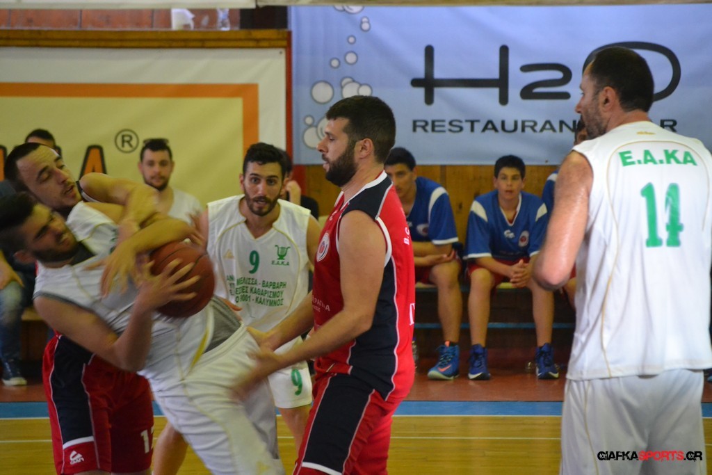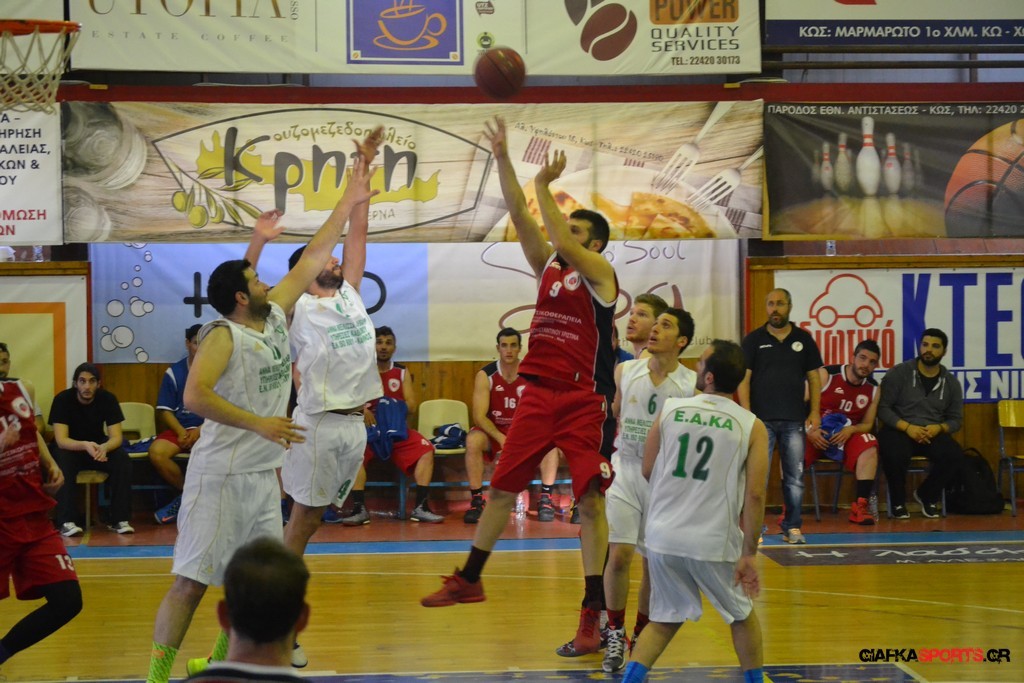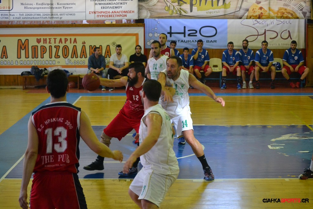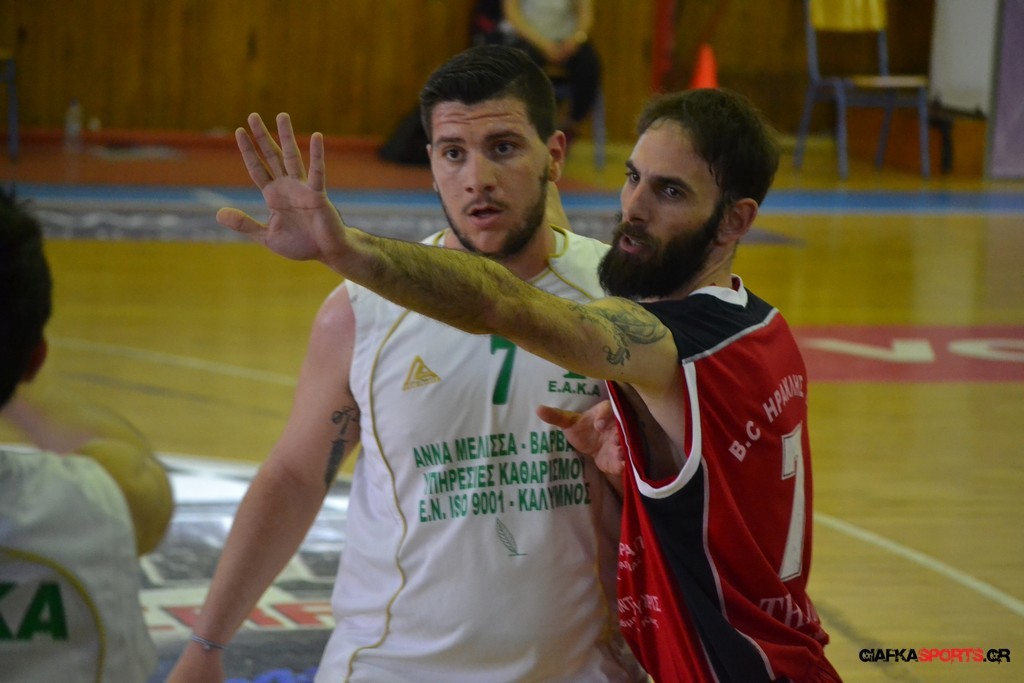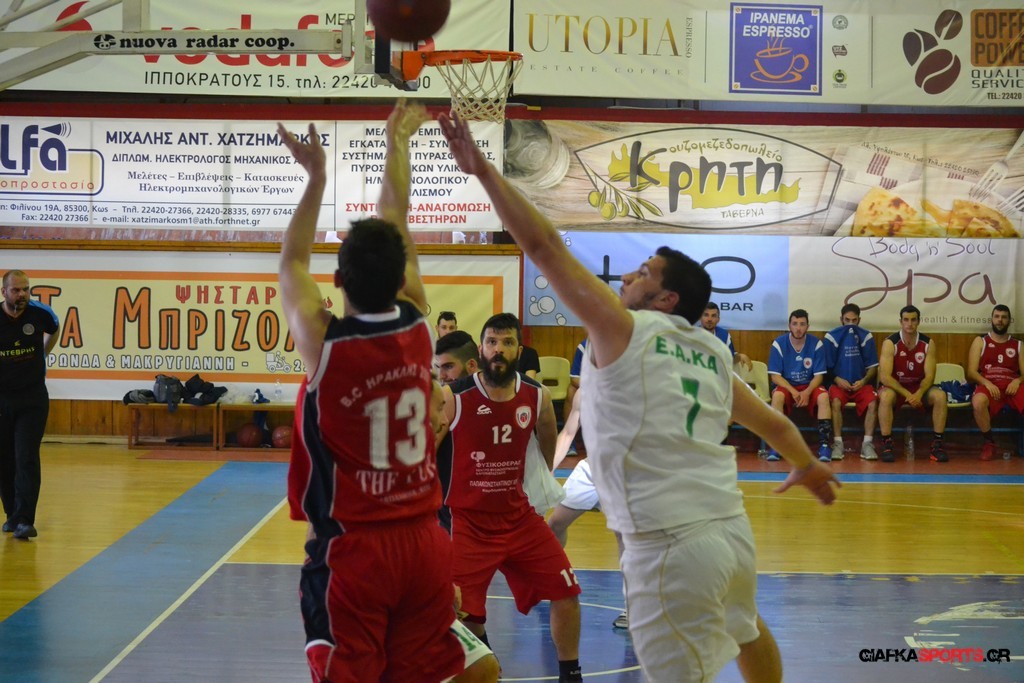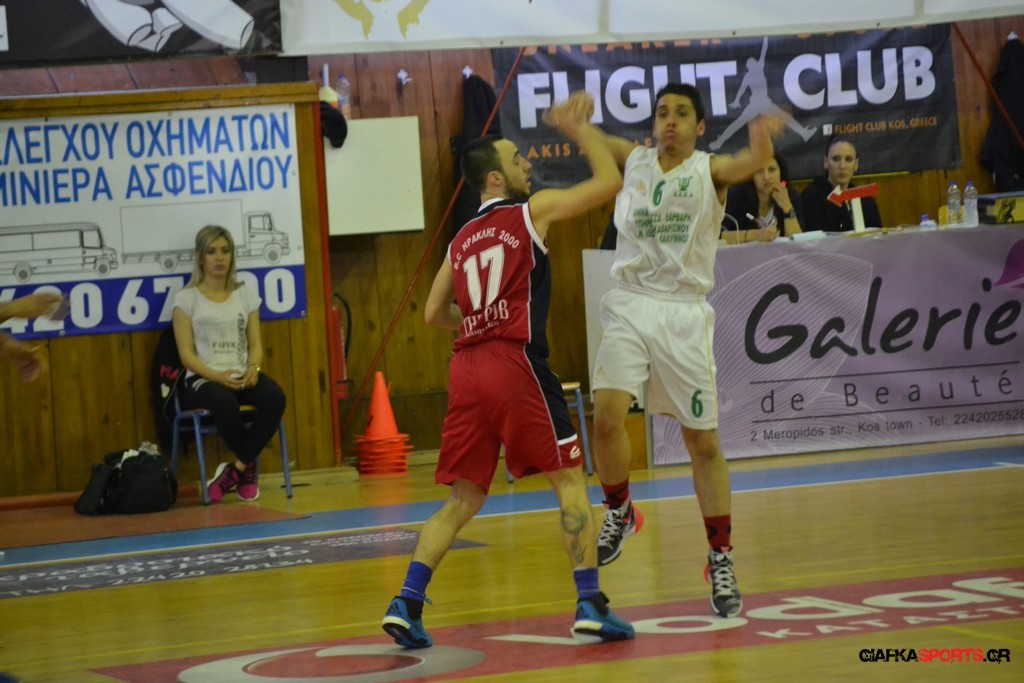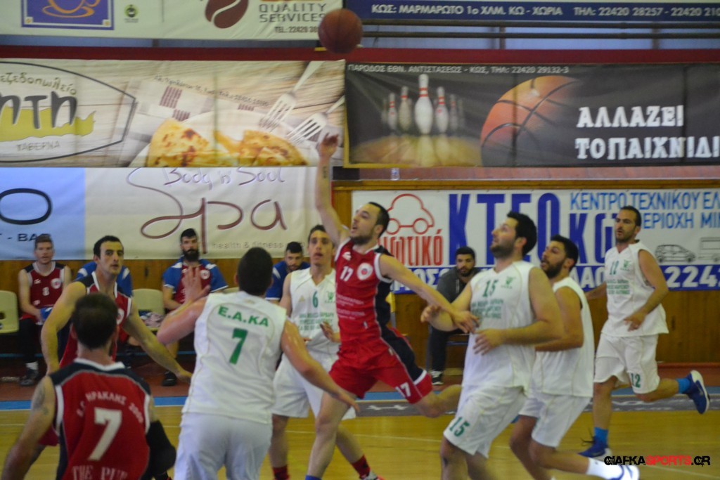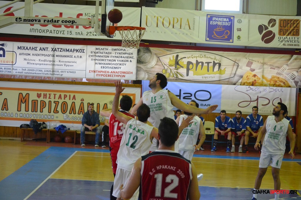 Η ομάδα της Καρδάμαινας επικράτησε με 47-43 στην παράταση της Ε.Α. Καλύμνου και ισοφάρισε σε 1-1 τη σειρά των αγώνων, με το τρίτο παιχνίδι να διεξάγεται στο κλειστό γυμναστήριο της Κω. Στο παιχνίδι «έσπασαν καρδιές» με τους Καλύμνιους να μην… «ματώνουν» το διχτάκι στο έξτρα πεντάλεπτο και την ομάδα του Γιάννη Παπούλη να πανηγυρίζει έστω και με το ζόρι μία πολύτιμη νίκη. Για να πάει το παιχνίδι στην παράταση χρειάστηκε μία βολή του Τσιάτσιου, μόλις 3.5’ πριν το τέλος, ώστε το σκορ να γίνει 43-43. Ας πάρουμε τα πράγματα από την αρχή… Ο Ηρακλής 2000 ξεκίνησε καλύτερα και προηγήθηκε 15-7 (6’), ενώ επέβαλε πλήρως το ρυθμό του και ξέφυγε 24-13 στο 18’. Είναι χαρακτηριστικό ότι η Ε.Α.ΚΑ. σε διάστημα οκτώ λεπτών πέτυχε μόλις μία βολή, ωστόσο κατάφερε να μειώσει στο ημίχρονο σε 24-19. Στο β’ ημίχρονο, η εικόνα του αγώνα άλλαξε με την Ε.ΑΚΑ. να είναι καλύτερη και να μειώνει με τρίποντο του Κοκκινίδη σε 28-27 (27’), ενώ με προσπάθεια του Ζερβού πέρασε μπροστά 28-29 (28’). Το τρίτο δεκάλεπτο έληξε 34-33, ενώ μ’ ένα ξέσπασμα ο Ηρακλής 2000 έκανε το 41-34 (34.30’) με γκολ-φάουλ του Γούναρη και δίποντο του Χριστοδούλου. Εκεί που πίστεψαν όλοι ότι το παιχνίδι είχε τελειώσει, η Ε.Α.ΚΑ. επέστρεψε δυναμικά.