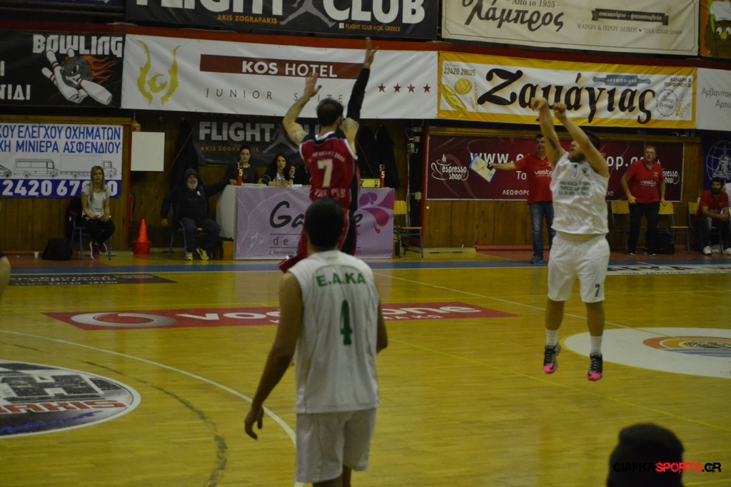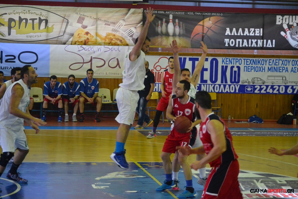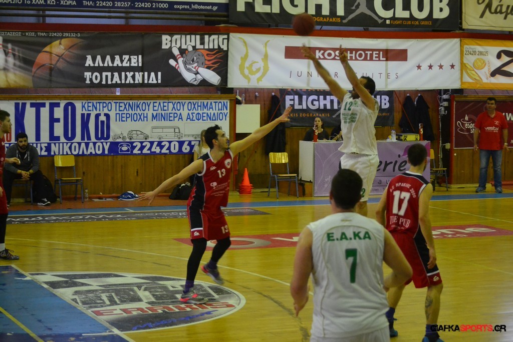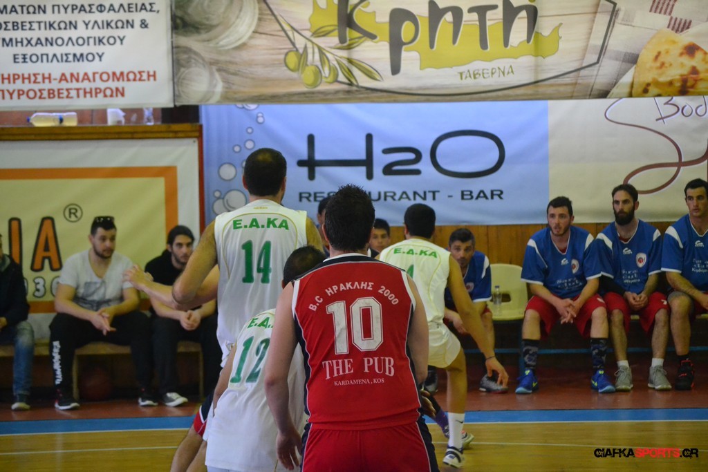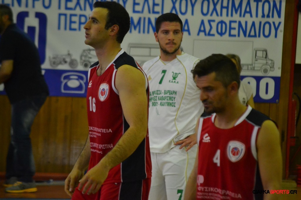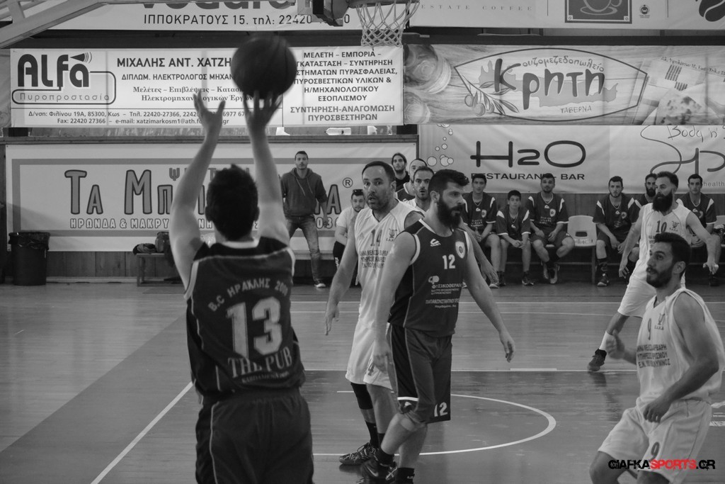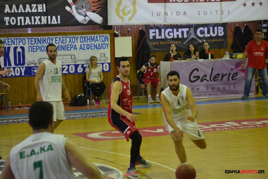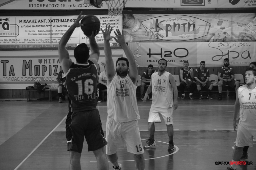 Η ομάδα της Καρδάμαινας επικράτησε με 47-43 στην παράταση της Ε.Α. Καλύμνου και ισοφάρισε σε 1-1 τη σειρά των αγώνων, με το τρίτο παιχνίδι να διεξάγεται στο κλειστό γυμναστήριο της Κω. Στο παιχνίδι «έσπασαν καρδιές» με τους Καλύμνιους να μην… «ματώνουν» το διχτάκι στο έξτρα πεντάλεπτο και την ομάδα του Γιάννη Παπούλη να πανηγυρίζει έστω και με το ζόρι μία πολύτιμη νίκη. Για να πάει το παιχνίδι στην παράταση χρειάστηκε μία βολή του Τσιάτσιου, μόλις 3.5’ πριν το τέλος, ώστε το σκορ να γίνει 43-43. Ας πάρουμε τα πράγματα από την αρχή… Ο Ηρακλής 2000 ξεκίνησε καλύτερα και προηγήθηκε 15-7 (6’), ενώ επέβαλε πλήρως το ρυθμό του και ξέφυγε 24-13 στο 18’. Είναι χαρακτηριστικό ότι η Ε.Α.ΚΑ. σε διάστημα οκτώ λεπτών πέτυχε μόλις μία βολή, ωστόσο κατάφερε να μειώσει στο ημίχρονο σε 24-19. Στο β’ ημίχρονο, η εικόνα του αγώνα άλλαξε με την Ε.ΑΚΑ. να είναι καλύτερη και να μειώνει με τρίποντο του Κοκκινίδη σε 28-27 (27’), ενώ με προσπάθεια του Ζερβού πέρασε μπροστά 28-29 (28’). Το τρίτο δεκάλεπτο έληξε 34-33, ενώ μ’ ένα ξέσπασμα ο Ηρακλής 2000 έκανε το 41-34 (34.30’) με γκολ-φάουλ του Γούναρη και δίποντο του Χριστοδούλου. Εκεί που πίστεψαν όλοι ότι το παιχνίδι είχε τελειώσει, η Ε.Α.ΚΑ. επέστρεψε δυναμικά.
