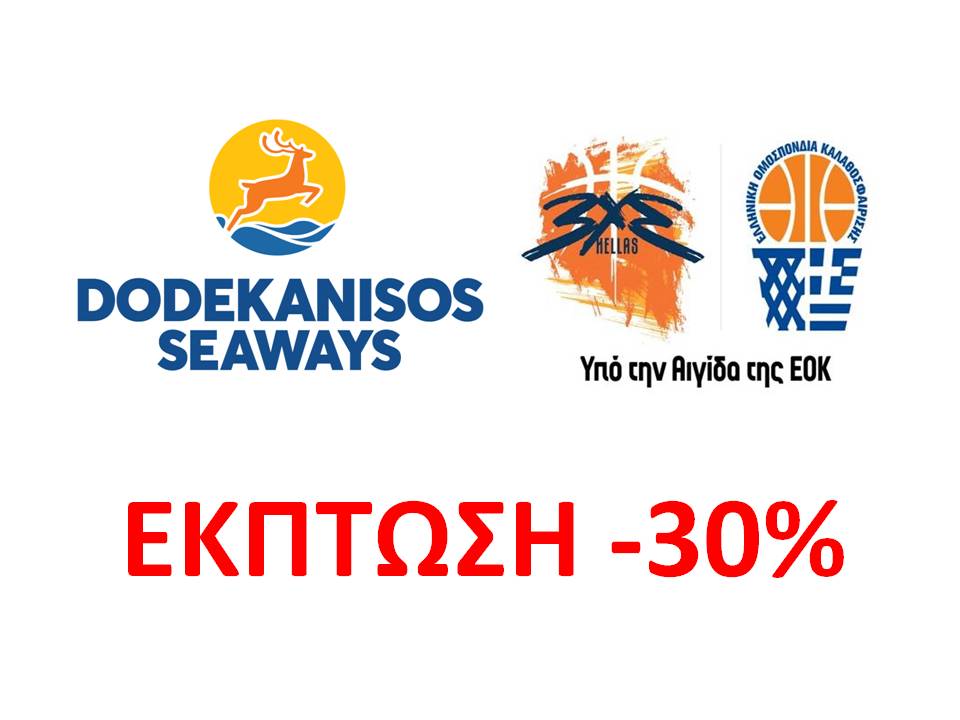 Η Ακαδημία Καλύμνου με ανακοίνωση της αναφέρει ότι θα παρέχεται έκπτωση 30% από τη Dodekanisos Seaways σε όσους θέλουν να ταξιδέψουν και να πάρουν μέρος στο τουρνουά 3οn3. Αναλυτικά, η ανακοίνωση: ”Σας ενημερώνουμε ότι η DODEKANISOS SEAWAYS παρέχει έκπτωση-30% από την αρχική τιμή των εισιτηρίων, για την μετακίνηση των αθλητών προς και από Κάλυμνο, για το τουρνουά του 3Χ3 που διοργανώνει η ομάδα μας.