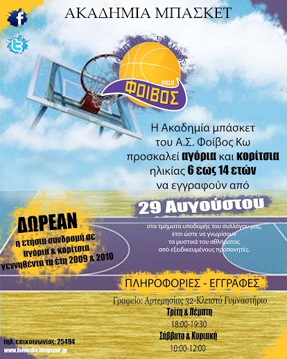 Η Ακαδημία μπάσκετ του Α.Σ. Φοίβος Κω, προσκαλεί αγόρια και κορίτσια ηλικίας 6 έως 14 ετών να εγγραφούν από 29 Αυγούστου 2016, στα τμήματα υποδομής του συλλόγου μας, έτσι ώστε να γνωρίσουν τα μυστικά του αθλήματος από εξειδικευμένους προπονητές.