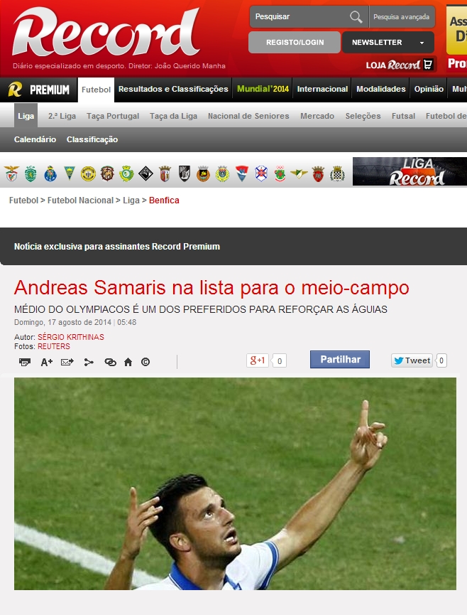 Σύμφωνα με την πορτογαλική «Record», ο άσος του Ολυμπιακού είναι στο στόχαστρο των «αετών» της Λισσαβώνας και δεν αποκλείεται να κινηθούν για την απόκτησή του.
