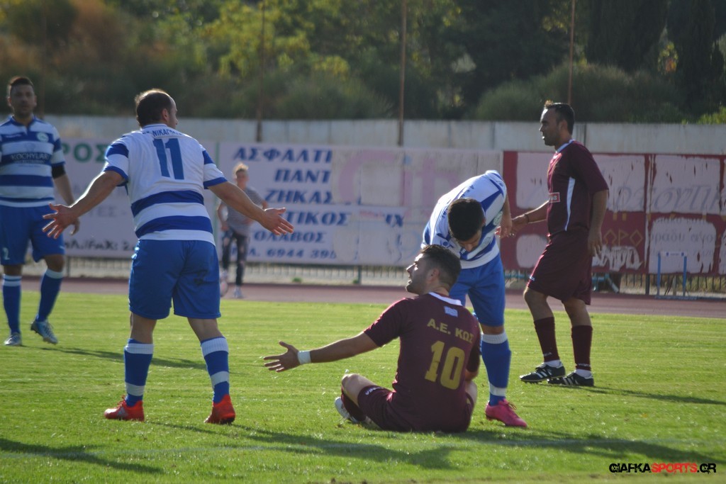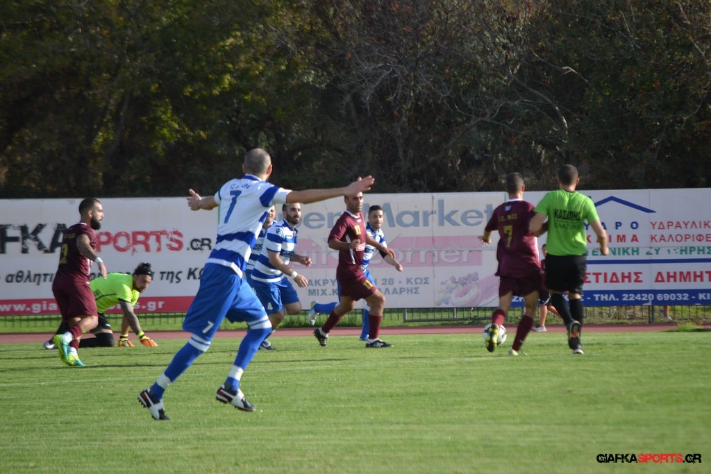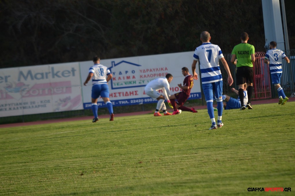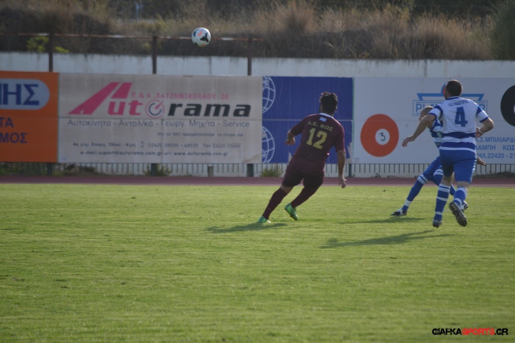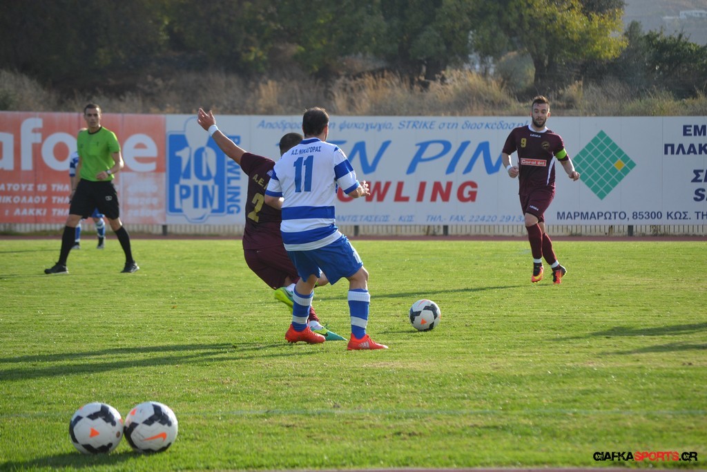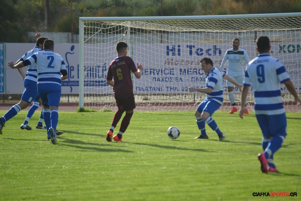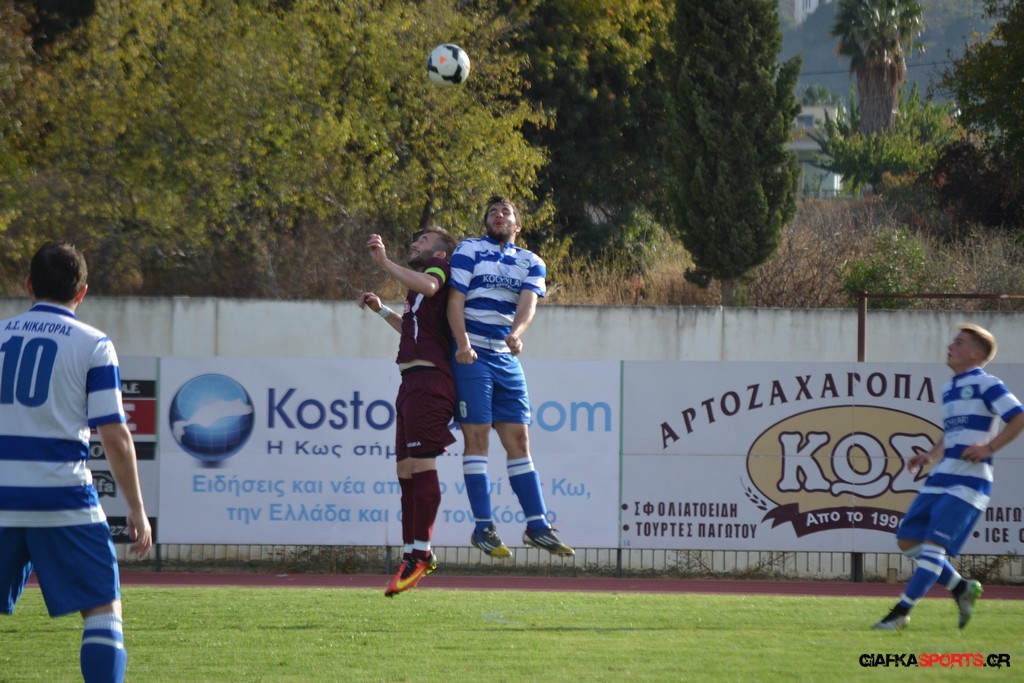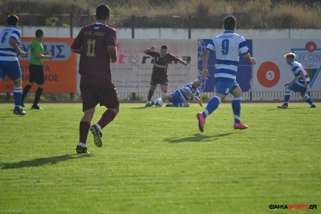 Την πορεία της προς τον φετινό τίτλο της Β’ κατηγορίας του Ομίλου νήσων συνεχίζει η Α.Ε Κως που επικράτησε με 5-1 του Νικαγόρα στο τοπικό ντέρμπι της 3ης αγωνιστικής και πάει με το απόλυτο (9 βαθμούς) στο ντέρμπι της επόμενης αγωνιστικής κόντρα στον Α.Ο Δικαίου. Παπανικολάου (9’, 55’), Ζαίμι (43’),Βασιλειάδης (78’) και Ευθυμιάδης στο 82΄τα γκολ των νικητών ενώ για το Νικαγόρα μείωσε στο 77’ με πέναλτι ο Μάκης Ζερβός. Μοναδικό μελανό σημείο της αναμέτρησης η ένταση στο 45’ και η συμπλοκή μεταξύ των παικτών με τον Δημαράκη να αποβάλλει για τους «βυσσινί» τον Νυστάζο και για το Νικαγόρα τον Μανώλη Ζερβό.