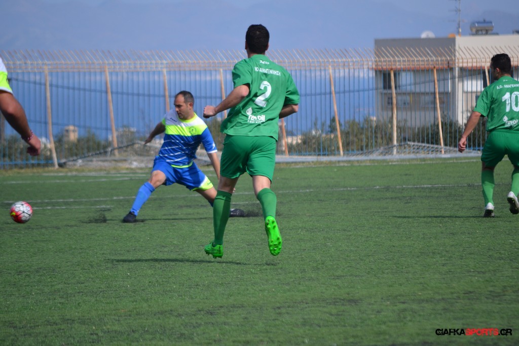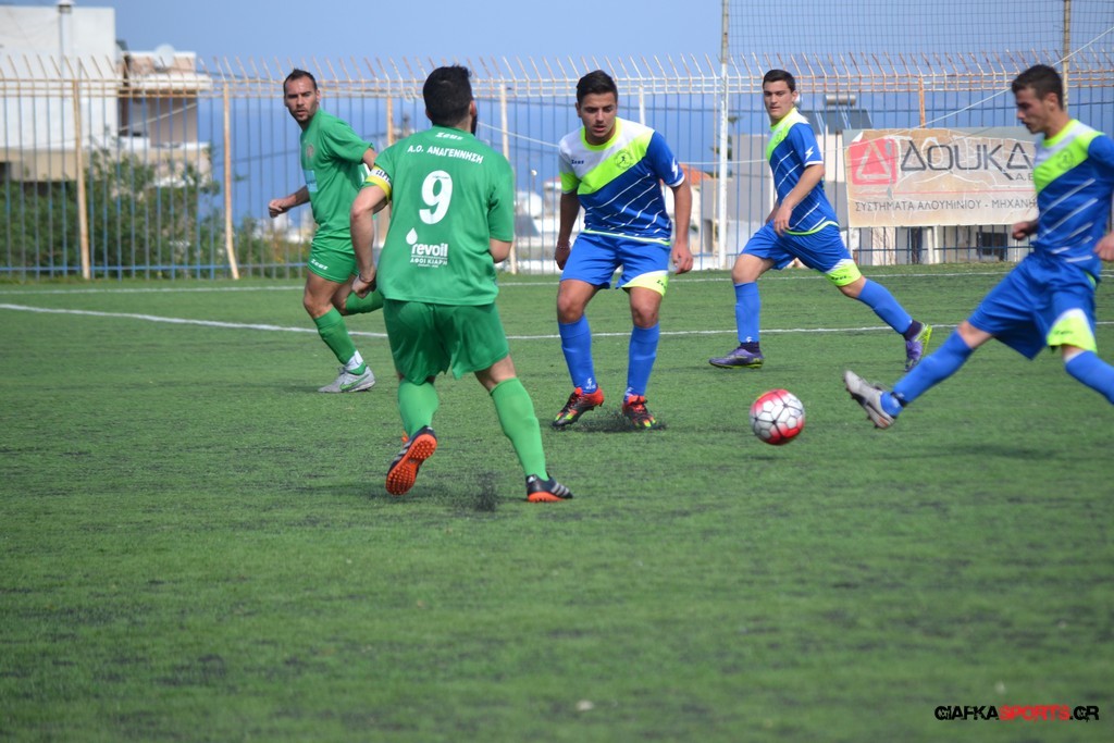 Με το ξεκίνημα της αναμέτρησης οι γηπεδούχοι έδειξαν ότι έχουν διάθεση να παίξουν ποδόσφαιρο πρωτοβουλίας και μόλις στο 19ο λεπτό μετά από κάθετη πάσα του Νομικού ο Φυτάς πρόλαβε τον προσωπικό του αντίπαλο και με διαγώνιο πλασέ έγραψε το 1-0. Οκτώ λεπτά αργότερα η Αναγέννηση διπλασίασε τα τέρματα της όταν μετά από σέντρα του Φυτά ο Τράκας έγινε κάτοχος της μπάλας και νίκησε τον Αμοργίνο για το 2-0. Οι γηπεδούχοι ήταν καλύτεροι, προσπαθούσαν να παίξουν απ’ τα πλάγια και πριν το τέλος του ημιχρόνου πέτυχαν και τρίτο γκολ με τον Γιώργο Φούκη μετά από σέντρα του Ματθαίο με κεφαλιά να γράφει το 3-0.