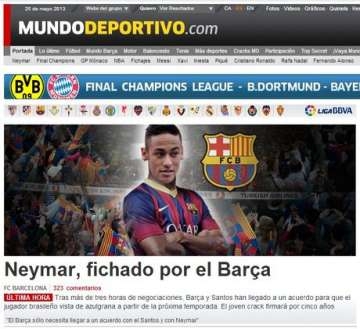 Αναλυτικά το δημοσίευμα της «Marca»: ‘Ο Νεϊμαρ θα αγωνιστεί στην Μπαρτσελόνα. Η συμφωνία της Σάντος με την καταλανική ομάδα ολοκληρώθηκε και μένουν κάποιες λεπτομέρειες να καθοριστούν ώστε να πέσουν οριστικά και οι υπογραφές. Ο Νεϊμάρ θα υπογράψει για 5 χρόνια και στην Μπαρτσελόνα ελπίζουν ότι θα τον ανακοινώσουν επίσημα μετά το ματς της Κυριακής με την Εσπανιόλ ή το αργότερο τη Δευτέρα”.