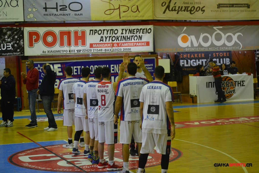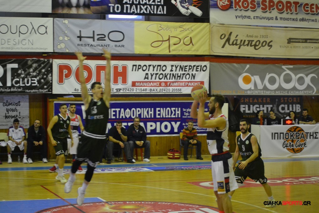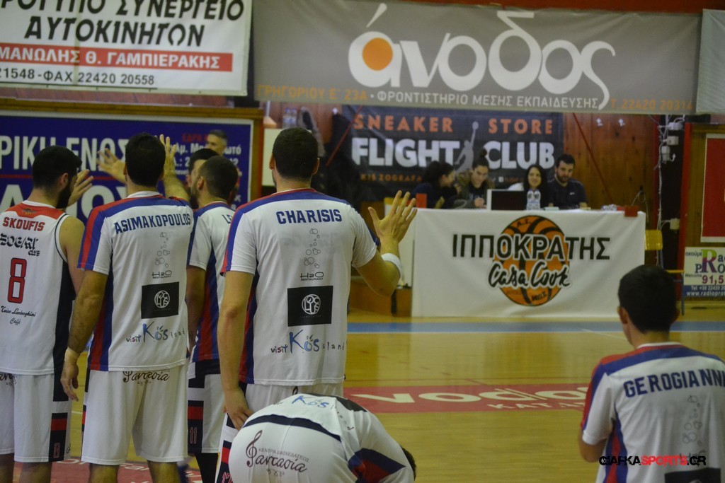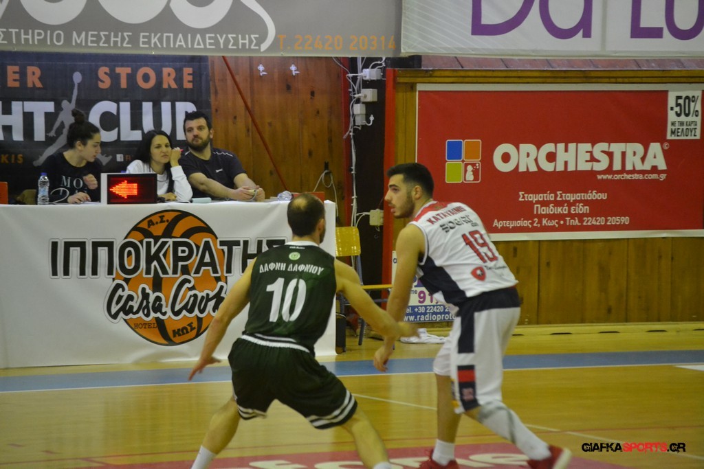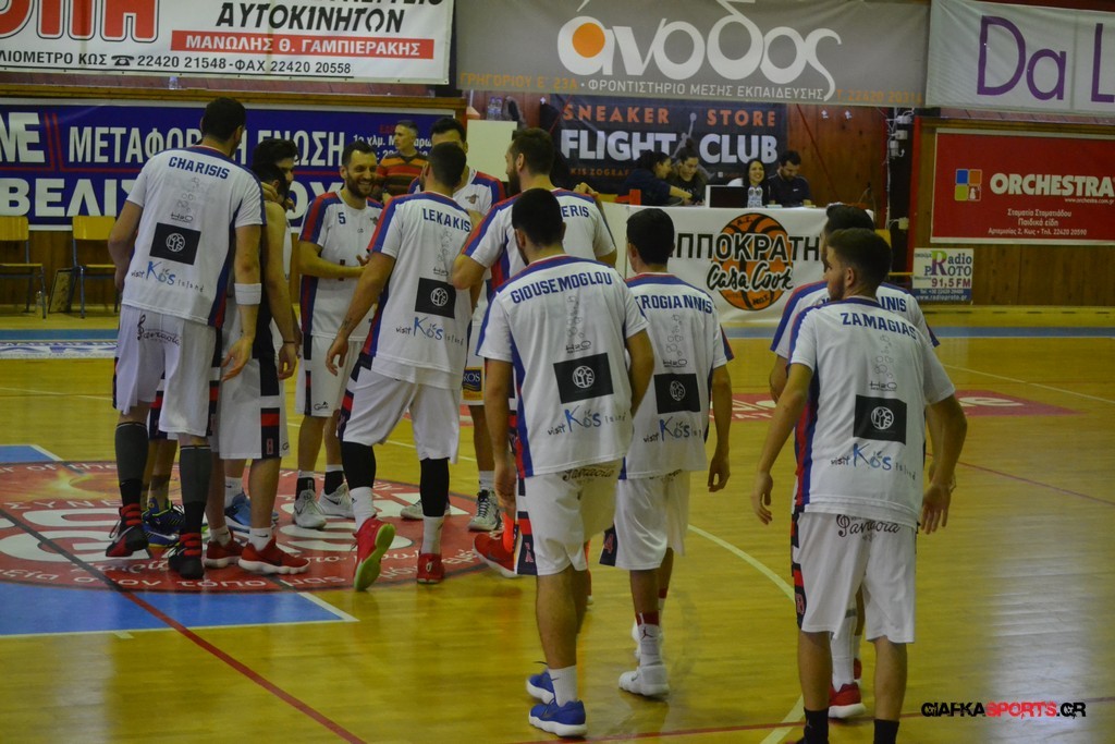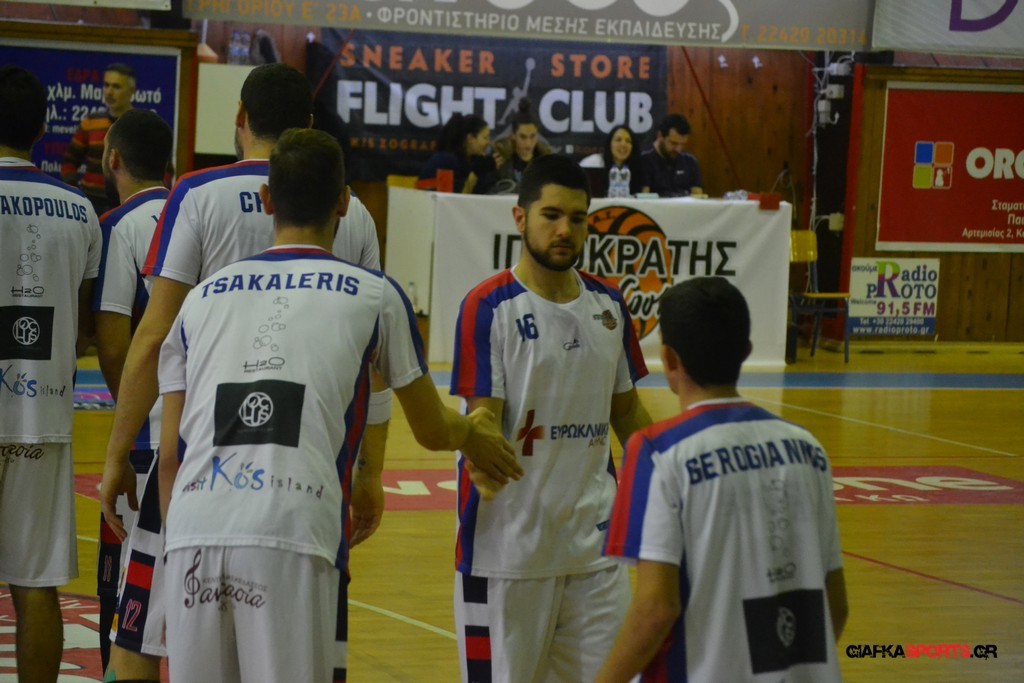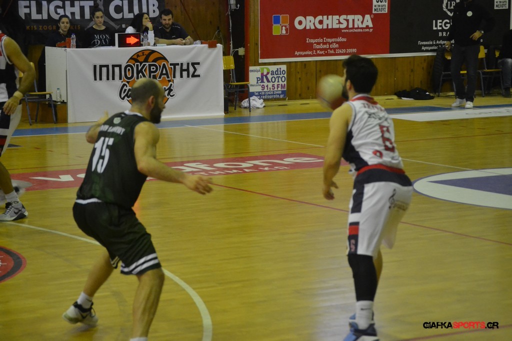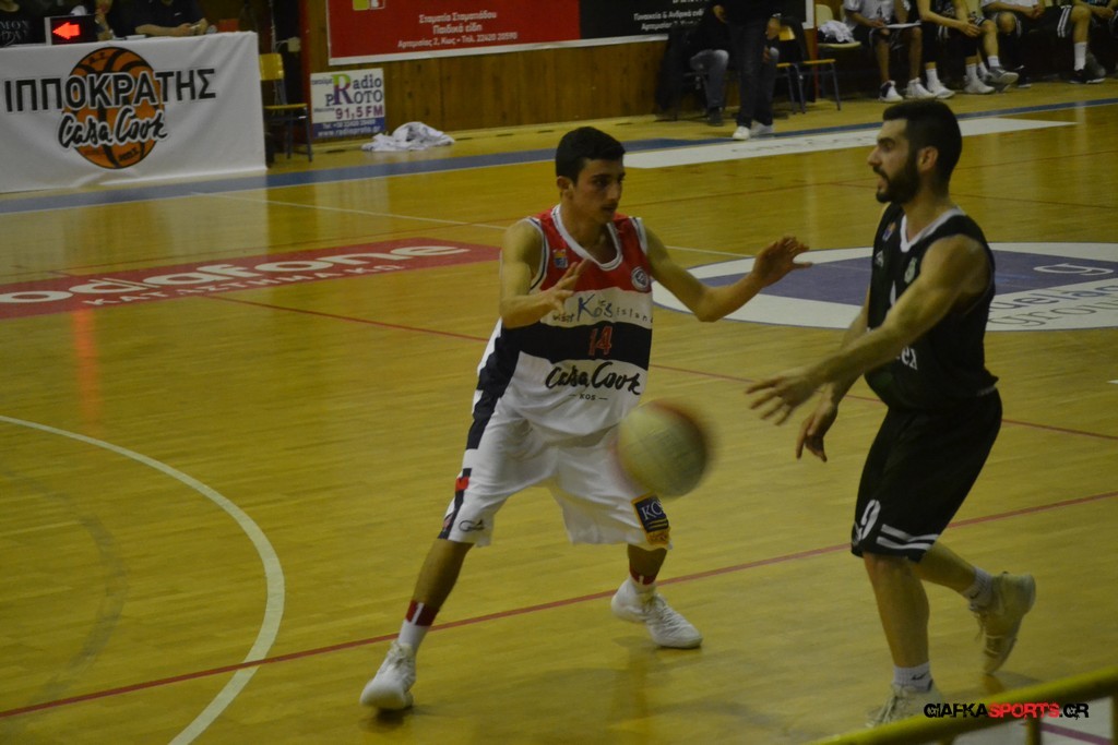 Με όπλο την εμπειρία των παικτών του και έχοντας κάθε δεκάλεπτο και ξεχωριστό πρωταγωνιστή, ο Ιπποκράτης πήρε το ροζ φύλλο αγώνα (την ίδια ώρα ο Διαγόρας Δρυοπιδέων κέρδιζε εκτός έδρας τον Πρωτέα Βούλας) και επέστρεψε στις νίκες, μετά την ήττα στη Νίκαια από τον τοπικό Ιωνικό. Η ομάδα του Χάρη Κουλουριώτη ήταν το απόλυτο «αφεντικό» του αγώνα, κάτι που φρόντισε να δείξει με το καλημέρα. Με αιχμή του δόρατος τον Ονάσογλου στο α’ δεκάλεπτο, οι Κώοι πήραν το προβάδισμα και μαζί μία σημαντική διαφορά (23-14). Στη συνέχεια τη σκυτάλη στο σκοράρισμα πήρε ο αρχηγός της ομάδας Αντώνης Ασημακόπουλος για να κλείσει το ημίχρονο με 47-35.