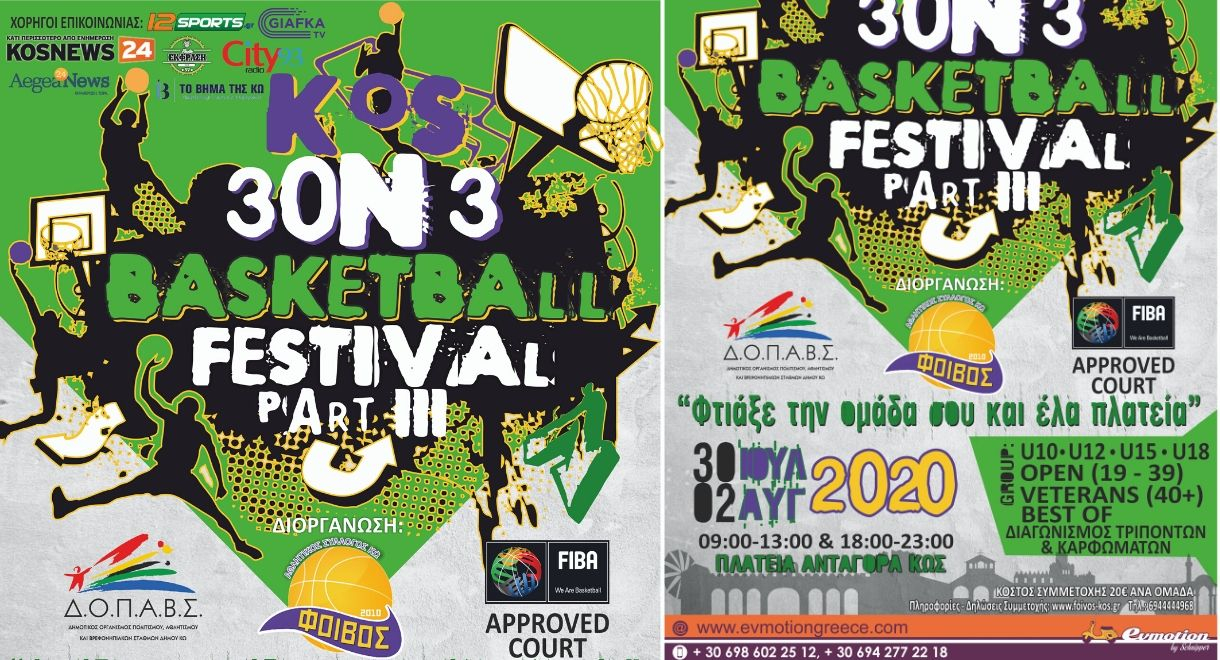 Ο Α.Σ. ΦΟΙΒΟΣ ΚΩ με την υποστήριξη του Δ.Ο.Π.Α.Β.Σ του Δήμου Κω, διοργανώνει το τρίτο κατά σειρά «Kos 3on3 Basketball Festival» από 30 Ιουλίου έως 02 Αυγούστου 2020. Η διεξαγωγή του τουρνουά θα πραγματοποιηθεί και πάλι στην πλατεία Ανταγόρα στην πόλη της Κω, σε ένα σύγχρονο γήπεδο που θα στηθεί ειδικά για τις ανάγκες της διοργάνωσης.