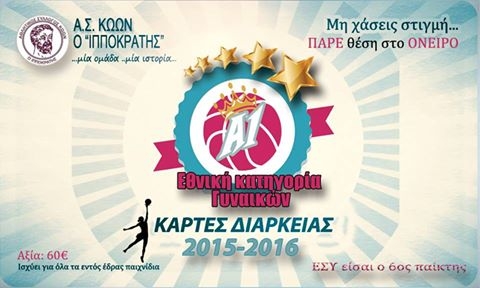 Με σύνθημα «Eσύ είσαι ο 6ος παίκτης» ξεκίνησε από σήμερα (19/9) η διάθεση των καρτών διαρκείας για την νέα αγωνιστική περίοδο 2015-2016, που θα βρει τη γυναικεία ομάδα του Α.Σ. Ιπποκράτη για μια ακόμα χρονιά στην Α1 Εθνική Κατηγορία γυναικών, ανάμεσα στις κορυφαίες ομάδες του αθλήματος
