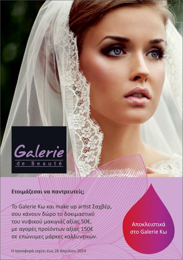Ετοιμάζεσαι να παντρυτείς; Το Galerie Κω και make up artist Σαχβέρ,  σου κάνουν δώρο το δοκιμαστικό  του νυφικού μακιγιάζ αξίας 50€, με αγορές προϊόντων αξίας 150€  σε επώνυμες μάρκες καλλυντικών.
