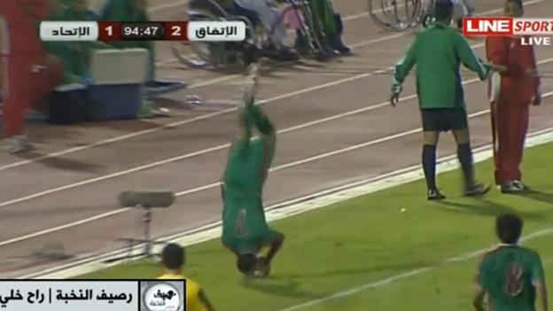 Μπορεί στην Σαουδική Αραβία να μην παίζεται ποδόσφαιρο αξιώσεων, όμως οι παίκτες βρίσκουν διάφορους εντυπωσιακούς τρόπους για να τραβήξουν τα βλέμματα. Ένας από αυτούς είναι ο Αλ Τραϊντί της Αλ Ιτιφάκ, ο οποίος εφαρμόζει την τακτική της… ανάποδης τούμπας πριν την εκτέλεση του πλάγιου. Πρέπει μάλλον να ξεκινάμε κι εμείς πια να εκτελούμε τα πλάγια όπως αυτός ο μεγάλος παίκτης……
