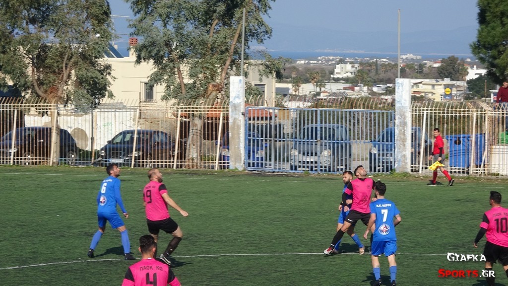 Οι φιλοξενούμενοι είχα απ’ το ξεκίνημα τον έλεγχο της αναμέτρησης και έψαξαν κυρίως απ’ τα πλάγια να απειλήσουν χάνοντας ευκαιρίας με τους Φουντή και Καράγκιολη να ανοίξουν το σκορ. Ο ΠΑΟΚ Κω προσπαθούσε κυρίως να κλείσει καλά τους χώρους όμως στο 25’ μετά από λάθος στον χώρο της μεσαίας γραμμής ο Κόκκαλης μετά από κάθετη πάσα είχε τον χώρο να επιτεθεί, πάτησε περιοχή και πλάσαρε εύστοχα τον Καραγιάννη για το 0-1.