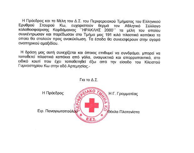 Ευχαριστήρια ανακοίνωση εξέδωσε ο ΕΕΣ Κω προς τον Ηρακλή 2000 αφού η ομάδα της Καρδάμαινας κατάφερε να συγκεντρώσει 191 κιλά πλαστικά καπάκια τα οποία θα σταλούν για ανακύκλωση.