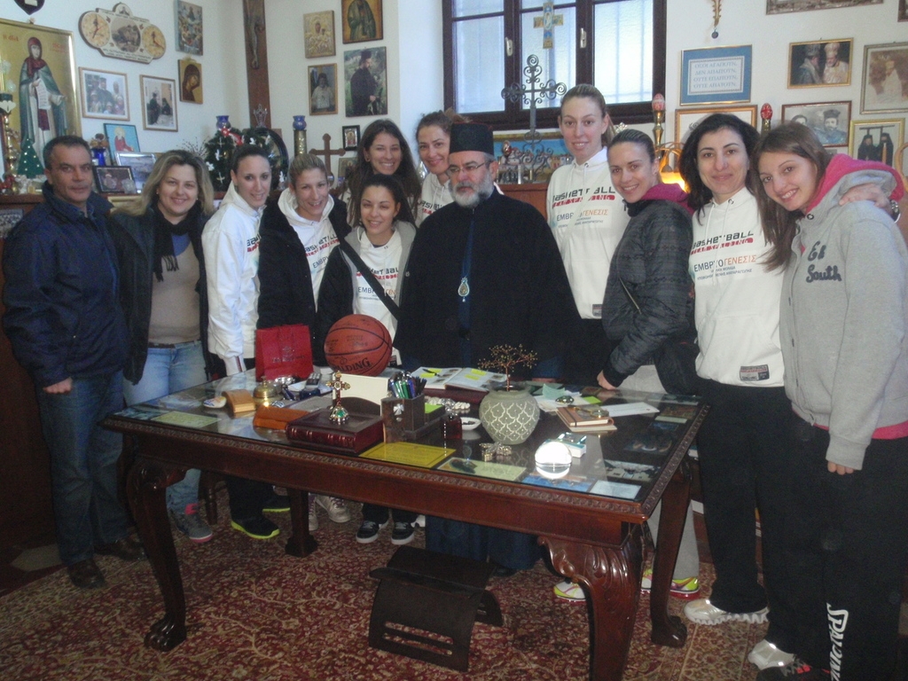 Συγκεκριμένα η αρχηγός της ομάδας Ελένη Δρεττάκη έδωσε στον Σεβασμιώτατο μια μπάλα του μπάσκετ με τις υπογραφές τους, συνοδεύοντας την με την ευχή να συνεχίσει να βάζει “τρίποντα” με την παρουσία και το κοινωνικό του έργο, όπως επίσης το πολύ όμορφο ημερολόγιο – ατζέντα του Ιπποκράτη και ένα γούρι το οποίο περιελάμβανε ένα ρόδι και ένα τσαρούχι…