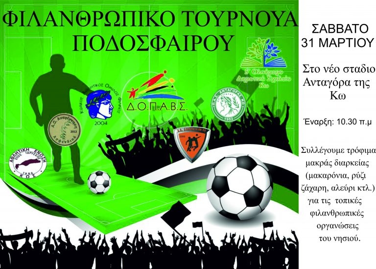 Το 5ο Δημοτικό Σχολείο σε συνεργασία με το Σύλλογο Γονέων και Κηδεμόνων του 5ου Δημοτικού Σχολείου Κω, τον Δημοτικό Οργανισμό Αθλητισμού Του Δήμου Κω (Δ.Ο.Π.Α.Β.Σ), τους αθλητικούς συλλόγους: Α.Ε.Κως, Π.Α.Σ. Ανταγόρας Κως, Α.Ο Αθλοπαιδιών, Αναγέννηση Ασφενδιού και Κ.Α.Ο. Φιλίνος, διοργανώνει το Σάββατο 31 Μαρτίου και ώρα 10.30 π.μ. φιλανθρωπικό τουρνουά ποδοσφαίρου στο νέο στάδιο Ανταγόρα της Κω.