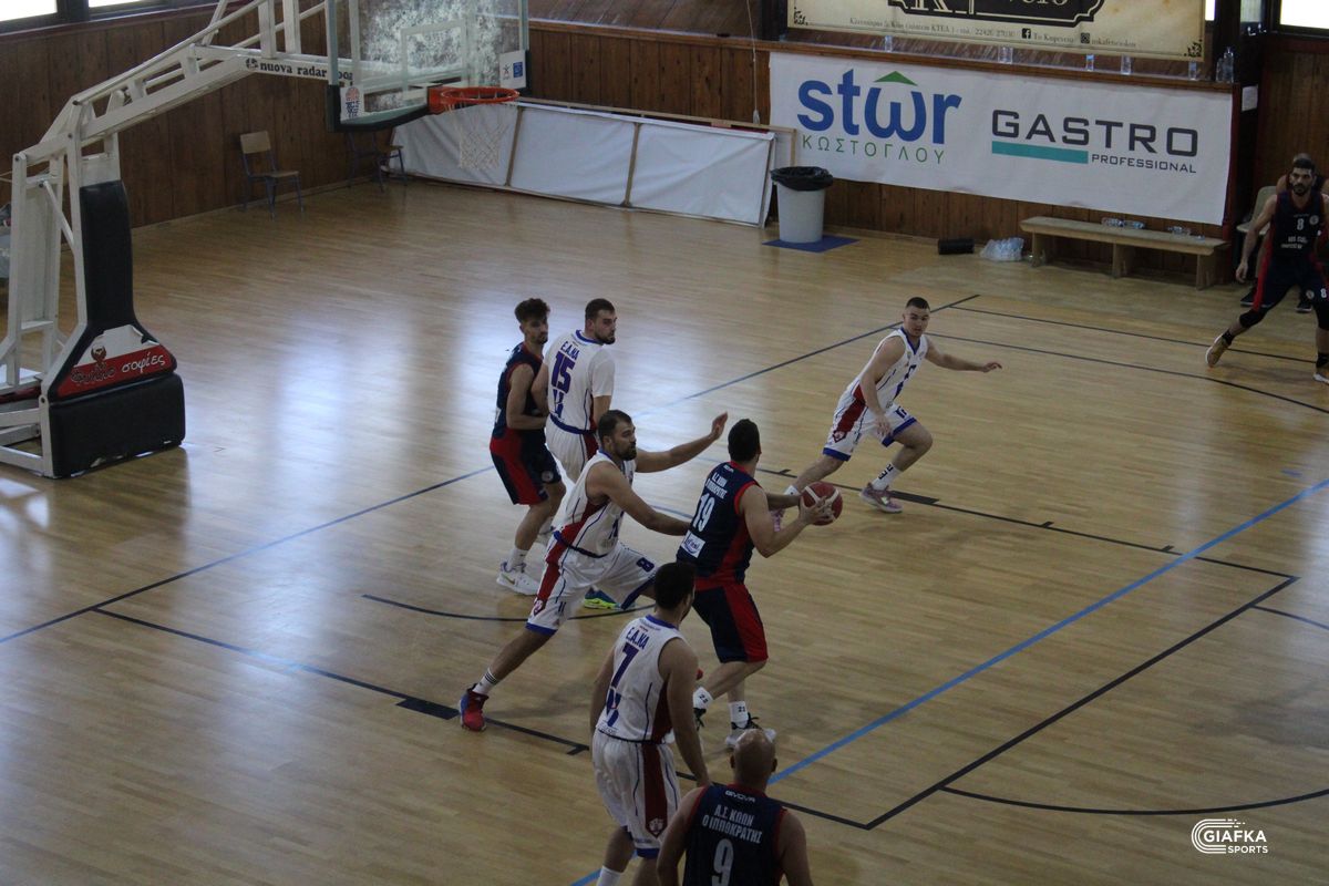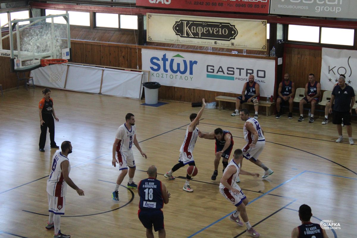 Οι Καλύμνιοι ξεκίνησαν δυνατά στο κλειστό γυμναστήριο της Κω και κάνοντας ένα καλό α’ δεκάλεπτο κατάφεραν να προηγηθούν με μεγάλη διαφορά (12-27), έχοντας υπεροπλία μέσα κι έξω από τη ρακέτα. Οι αρκετές αλλαγές και οι φυσιολογικές μεταπτώσεις στην απόδοση της Ε.Α.ΚΑ., είχαν ως αποτέλεσμα ο Ιπποκράτης να ισορροπήσει το παιχνίδι και να κερδίσει στο β’ δεκάλεπτο (13-11 το επιμέρους σκορ), με την ομάδα του Πέτρου Αργυρίου να μειώνει σε 25-38 στο ημίχρονο.