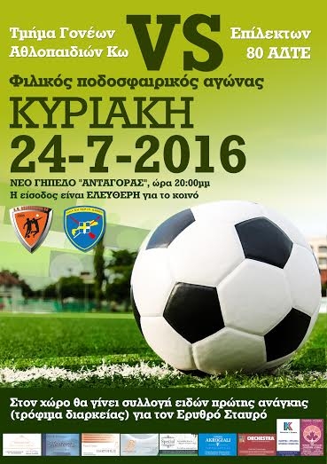 Φιλικός ποδοσφαιρικός αγώνας ανάμεσα στις Αθλοπαιδιές Κω και μία ομάδα επίλεκτων της 80 Α.Δ.Τ.Ε. θα διεξαχθεί την προσεχή Κυριακή στις 20:00, στο στάδιο «Ανταγόρας» της Κω. Το παιχνίδι θα έχει φιλανθρωπικό χαρακτήρα και στο χώρο θα γίνει συλλογή ειδών πρώτης ανάγκης (τρόφιμα διαρκείας) για τον Ερυθρό Σταυρό. Η είσοδος θα είναι ελεύθερη για το κοινό.