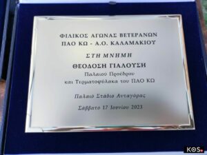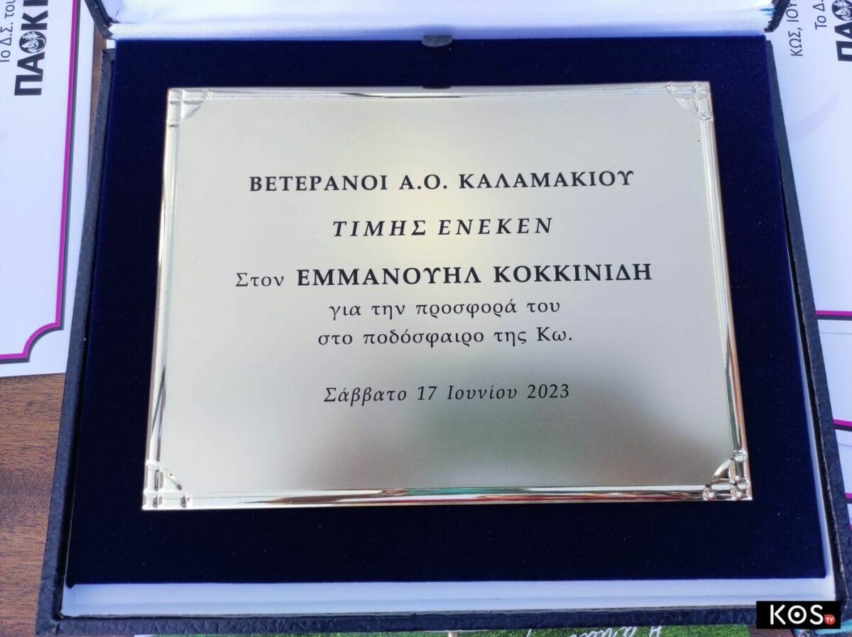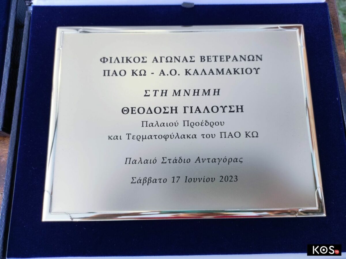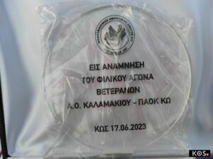 Στην ανάπαυλα του παιχνιδιού για το ημίχρονο ο ΠΑΟΚ Κω θέλησε να απονείμει τιμητική πλακέτα στον παλιό τερματοφύλακα και Πρόεδρο του συλλόγου, Σάκη Γιαλλούση, ο οποίος έφυγε πριν λίγους από τη ζωή…