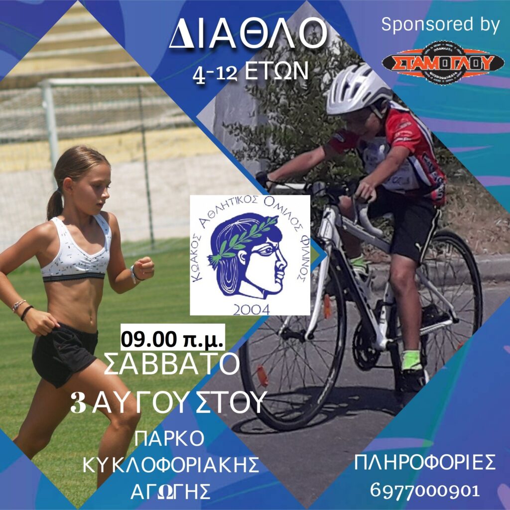 Το Σάββατο 3 Αυγούστου 09,00 π.μ. ο ΚΑΟ Φιλίνος Κω σε συνεργασία με την εταιρεία Εμμ.Σταμόγλου και ΥΙΟΙ ΟΕ διοργανώνει ΔΙΑΘΛΟ για παιδιά με τρέξιμο και ποδήλατο.