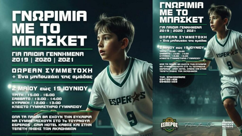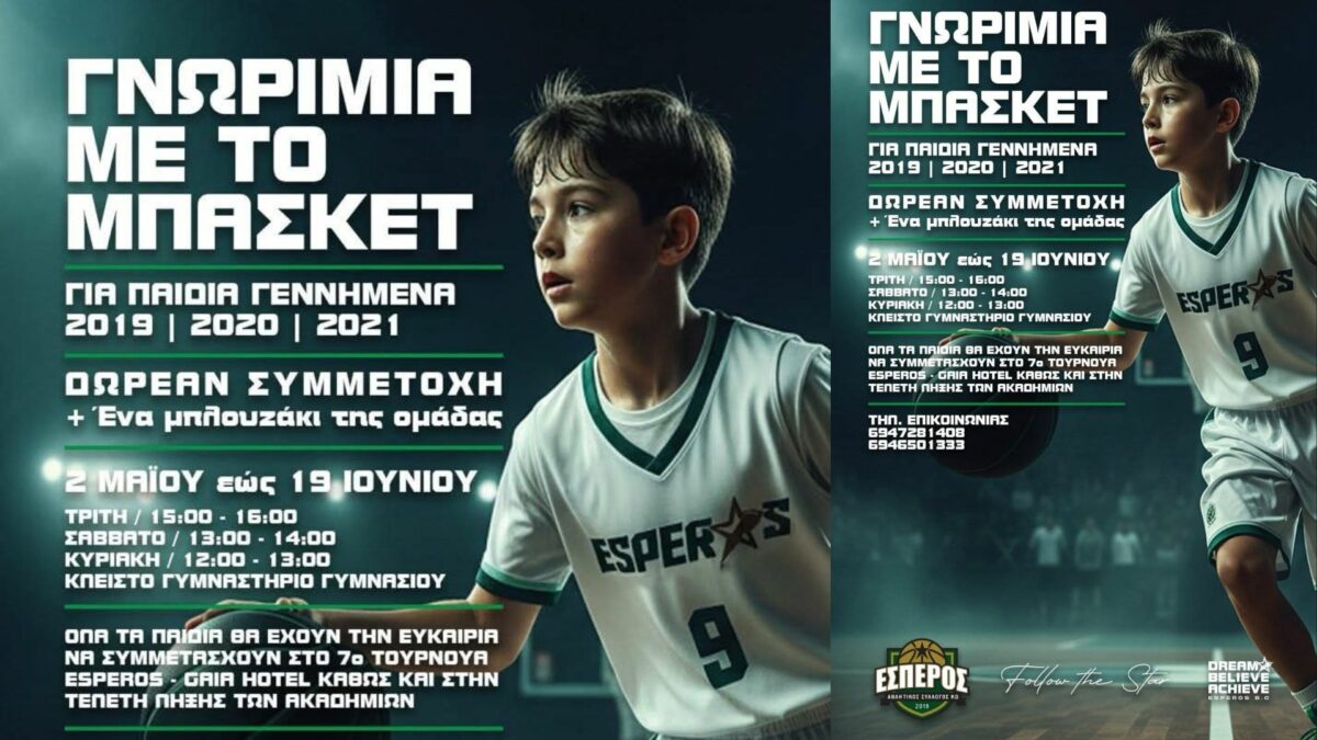 Ένα ξεχωριστό πρόγραμμα θα εφαρμόσει στο κλειστό γυμναστήριο του Γυμνασίου, ο Έσπερος Κω από 2 Μαΐου έως 19 Μαΐου, με την επωνυμία «Γνωριμία με το μπάσκετ» για παιδιά που γεννήθηκαν τα έτη 2019, 2020 και 2021, στα οποία θα δοθεί ένα μπλουζάκι της ομάδας, ενώ η συμμετοχή είναι ΔΩΡΕΑΝ. Όλα τα παιδιά που θα πάρουν μέρος θα έχουν την ευκαιρία να συμμετάσχουν στο 7ο τουρνουά Esperos- Gaia Hotel, καθώς και στην τελετή λήξης των ακαδημιών. Οι ώρες έχουν διαμορφωθεί ως εξής:
