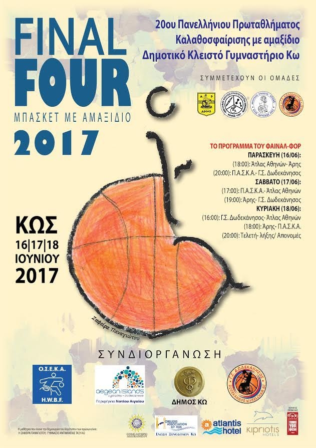 Η αφίσα του φάιναλ-φορ στο μπάσκετ με αμαξίδιο έχει την… υπογραφή της μαθήτριας Ζαφείρως Παναγιώτου από την Α2 τάξη του Γυμνασίου της Αντιμάχειας και κοσμεί όλο το έντυπο υλικό που έχουν ετοιμάσει οι διοργανωτές.