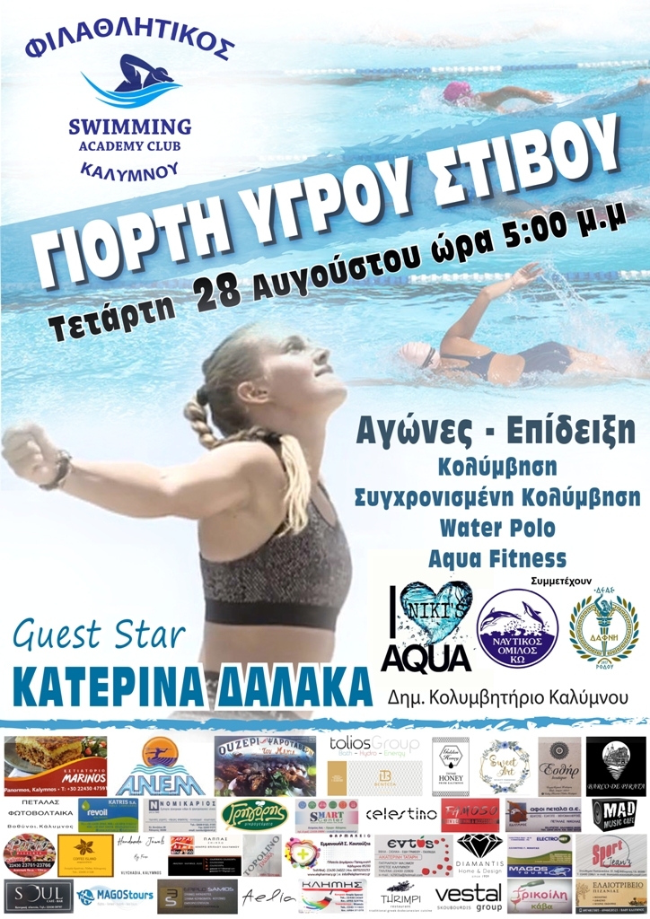 Την προσεχή Τετάρτη 28 Αυγούστου και συγκεκριμένα στις 17:00 θα γίνει η γιορτή του Φιλαθλητικού Καλύμνου με προσκεκλημένη τη νικήτρια του φετινού Survivor και αθλήτρια στίβου Κατερίνα Δαλάκα. Θα γίνουν αγώνες και επίδειξη κολύμβησης, συγχρονισμένης κολύμβησης, water polo και aqua fitness στο δημοτικό κολυμβητήριο της Καλύμνου. Ο Φιλαθλητικός ετοίμασε και την αφίσα της γιορτής του, στην οποία φυσικά θα πάρουν μέρος όλοι οι αθλητές και αθλήτριες του.