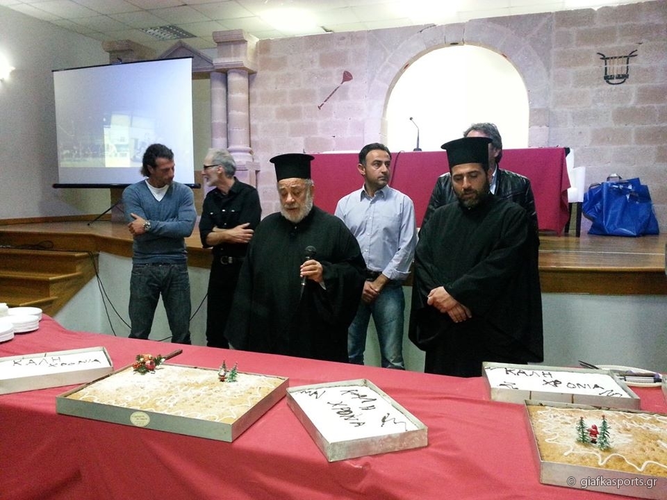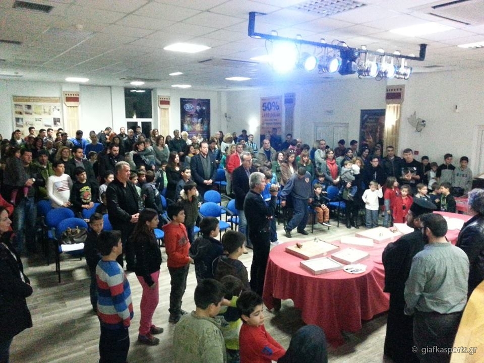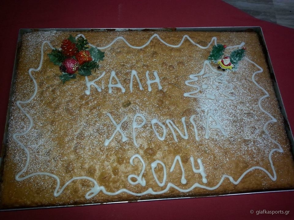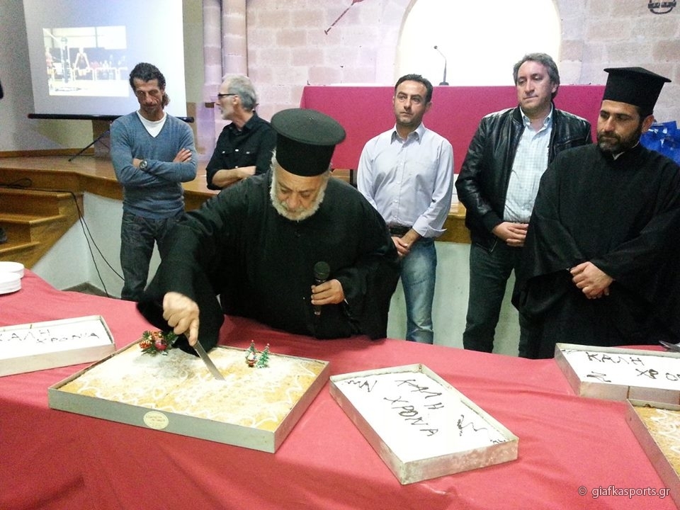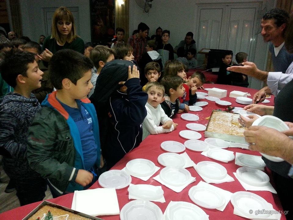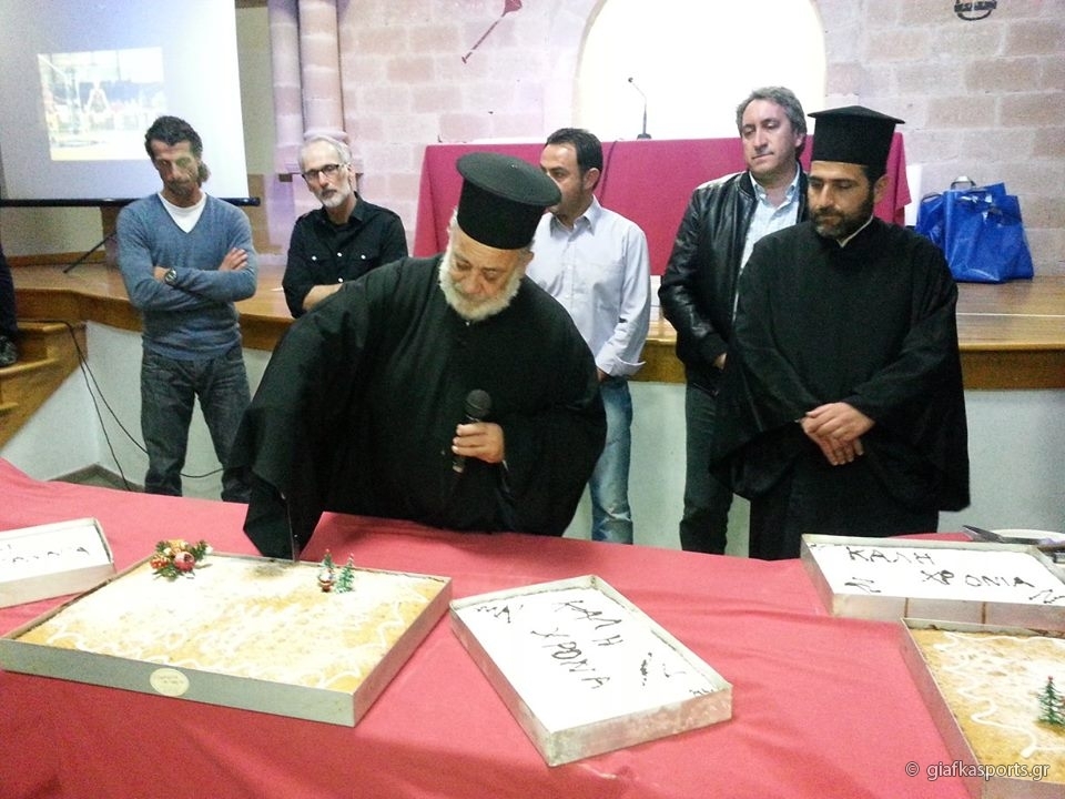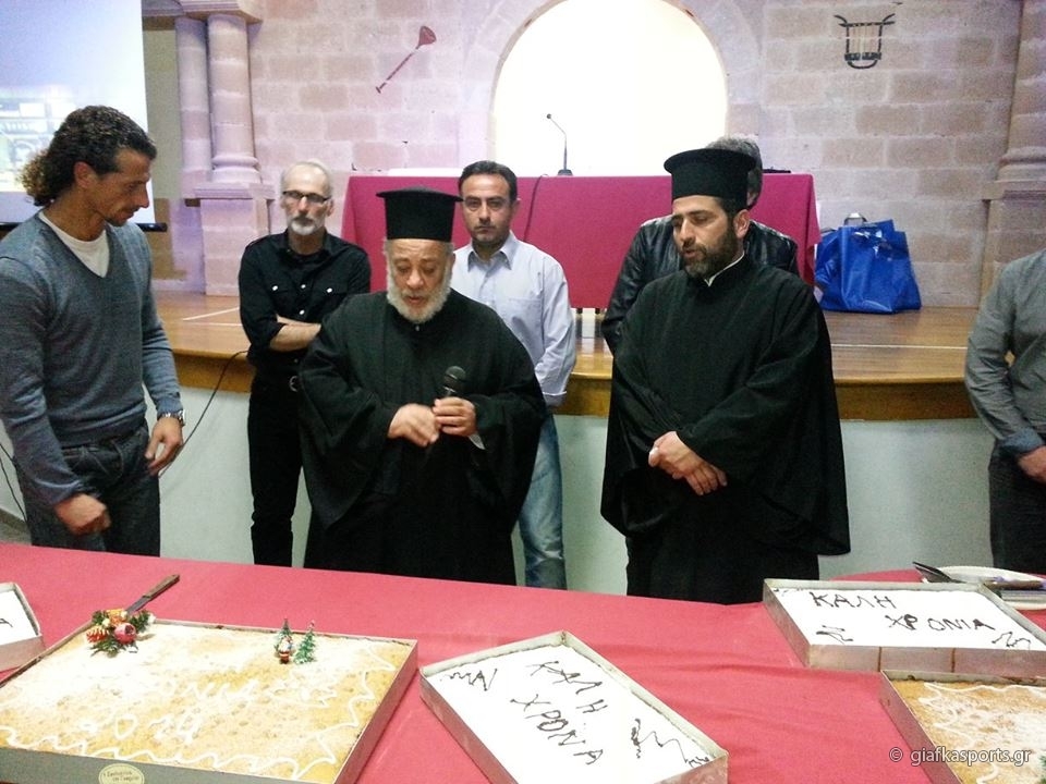 Την κοπή της πίτας έκανε ο παπά-Γιάννης που συνεχάρη τον όμιλο για τις επιτυχίες του αλλά και για αυτά που προάγει,όπως την άμιλλα και το συναγωνισμό,που βοηθούν τα παιδιά να γίνονται καλοί άνθρωποι. Παράλληλα τόνισε τη σημασία του αθλητισμού στο να απομακρύνει τα παιδιά από τους ηλεκτρονικούς υπολογιστές και γενικότερα τον ηλεκτρονικό μαρασμό. “Το πνεύμα με τη γυμναστική μεγαλουργεί!” δήλωσε.