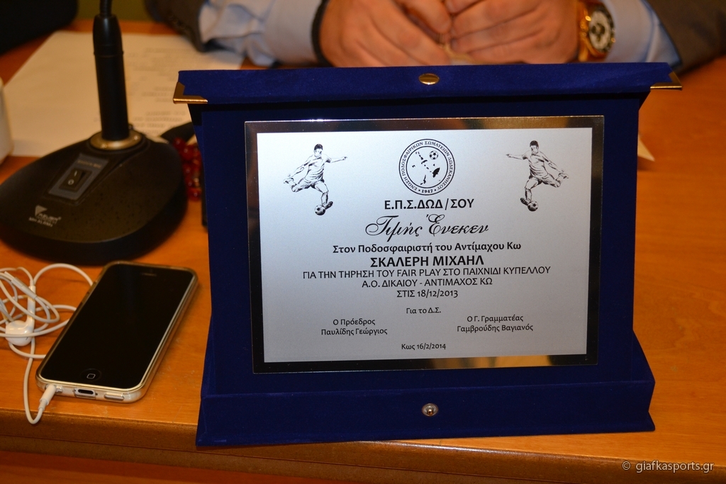 Στο περιθώρια της βραδιάς βραβεύτηκε η ομάδα του ΠΑΟΚ Κω που κατέκτησε την περσινή χρονιά το παιδικό πρωτάθλημα αλλά και ο Μιχάλης Σκαλέρης για το fair-play στο παιχνίδι Α.Ο Δικαίου-Αντίμαχος.
