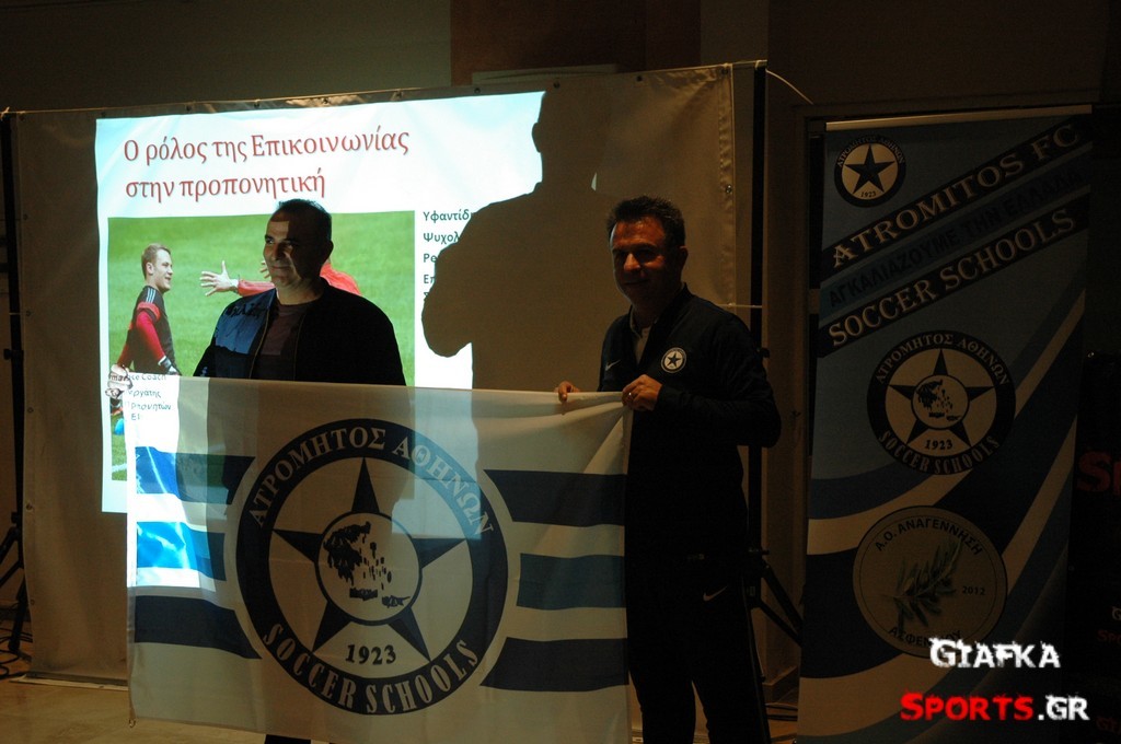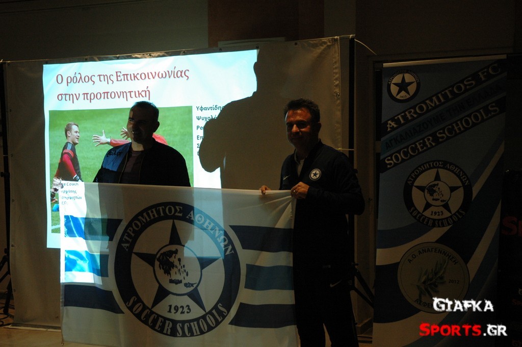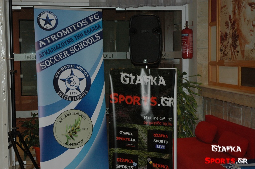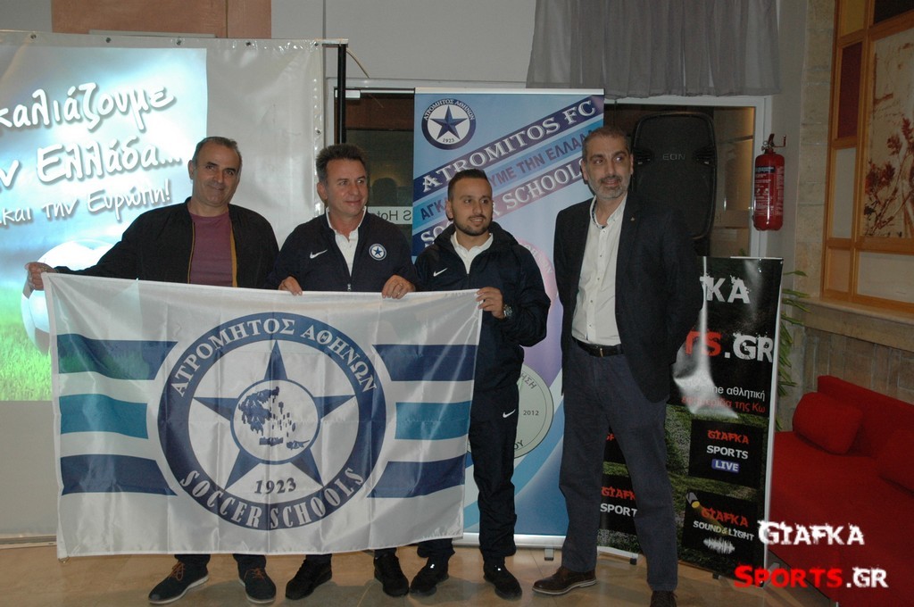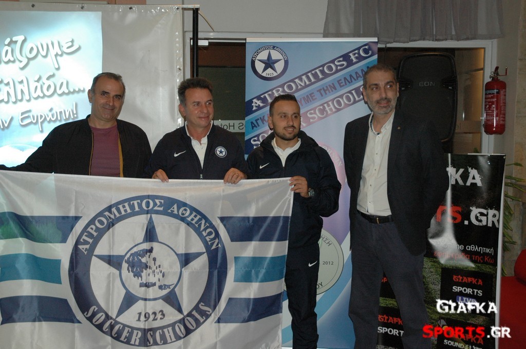 Ο υπεύθυνος των σχολών του Ατρομήτου τόνισε ότι στην Κω, και στην Αναγέννηση υπάρχουν οι κατάλληλες συνθήκες και προοπτικές γι’ αυτήν την συνεργασία τονίζοντας ότι όλα αυτά τα χρόνια έχει δημιουργήσει στενές σχέσεις με το νησί μας. Έκανε μια παρουσίαση της δουλειάς των δικτύων σχολών του Ατρομήτου δείχνοντας παίκτες που κάνουν καριέρα και ξεκίνησαν απ’ τον σύλλογο του Περιστερίου (Μπάρκας, Λημνιός, Κατράνης) ενώ έδειξε ποδοσφαιριστές που έγιναν πρόσφατα επαγγελματίες και κάποιοι από αυτούς παίζουν στις μικρές εθνικές, αλλά και τις όμορφες εγκαταστάσεις του Ατρομήτου. Αφού ολοκλήρωσε την ομιλία του παρέδωσε μια σημαία στον πρόεδρο της Αναγέννησης επικυρώνοντας έτσι την συνεργασία ανάμεσα στις δύο πλευρές.