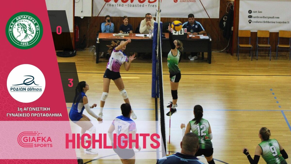 Για την 1η αγωνιστική του γυναικείου πρωταθλήματος το Ροδίων Άθλησις επικράτησε με 0-3 σετ του Ανταγόρα στο Κλειστό γυμναστήριο Κω «Δημήτρης Παππούλης». Δείτε τα highlights της αναμέτρησης απ’ το giafkasports.gr
