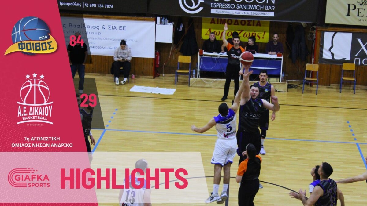 Για την 7η αγωνιστική του Ομίλου νήσων ο Φοίβος επικράτησε με 84-29 της Α.Ε Δικαίου. Δείτε τα highlights της αναμέτρησης απ’ το giafkasports.gr