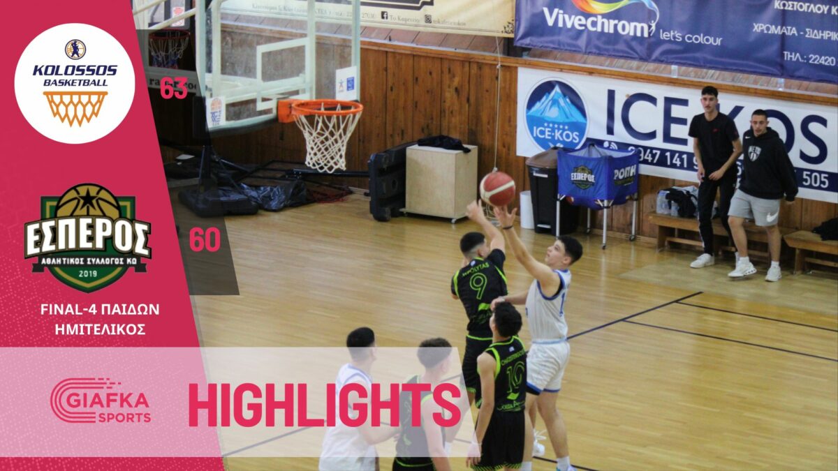 Ο Κολοσσός ήταν ο νικητής στον πρώτο ημιτελικό του Final-4 των παίδων αφού επικράτησε με 63-60 του Εσπέρου. Δείτε τα highlights της αναμέτρησης απ’ το giafkasports.gr