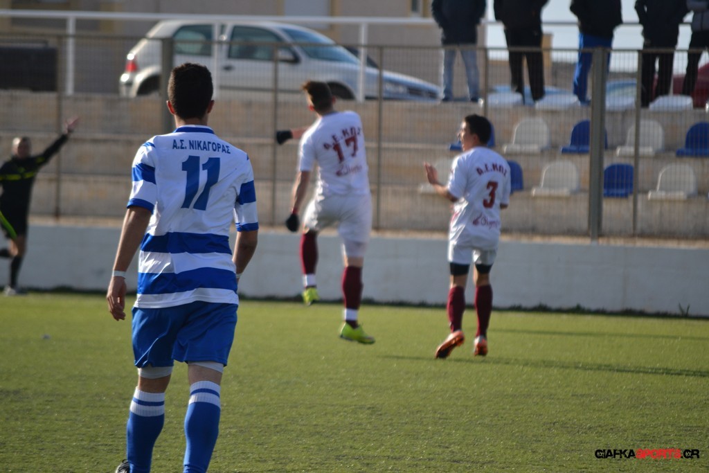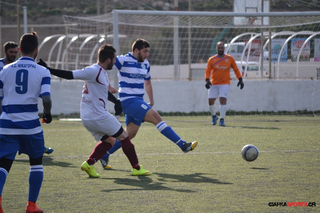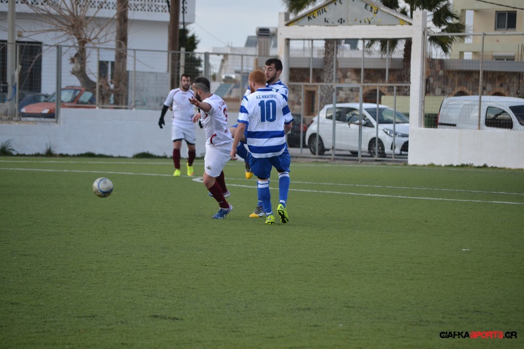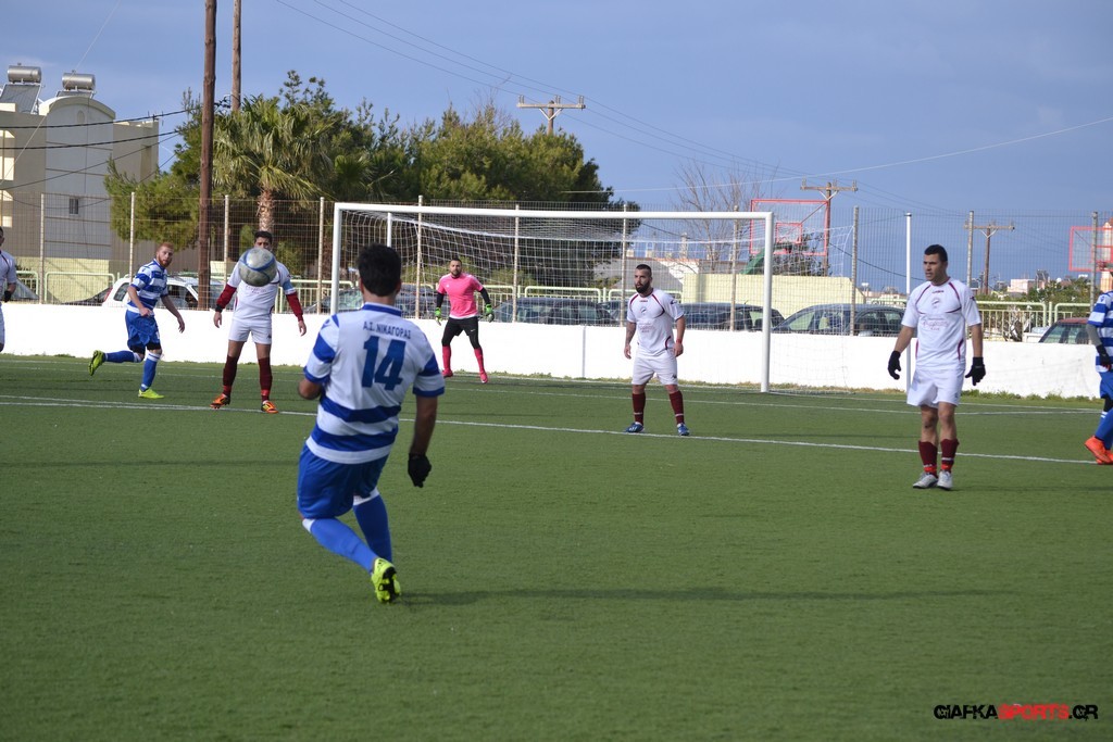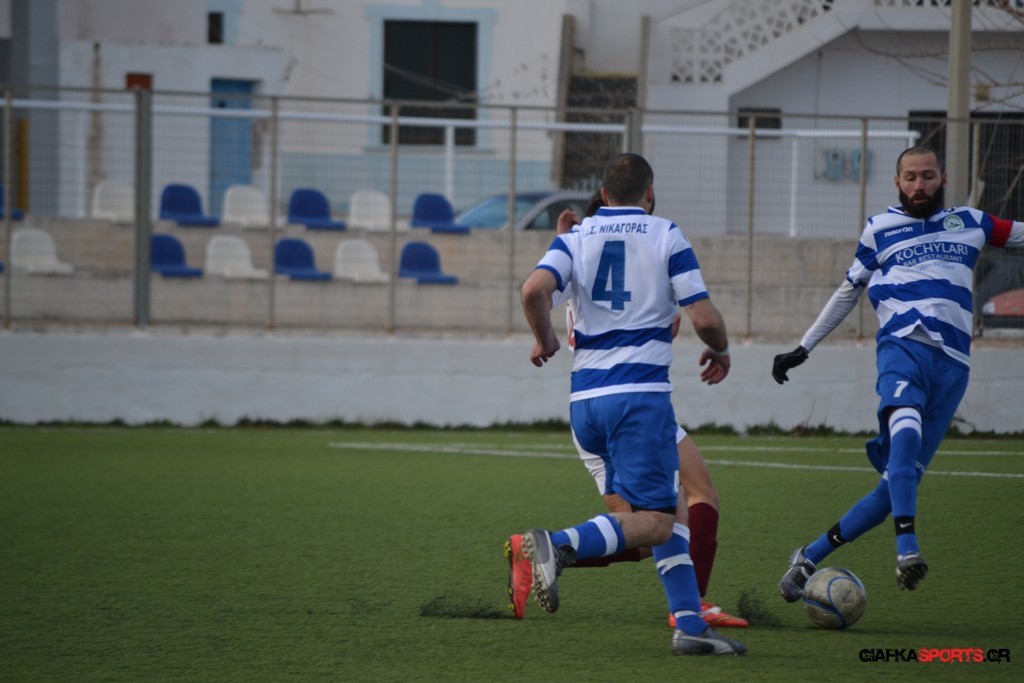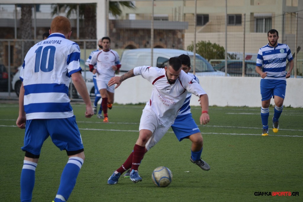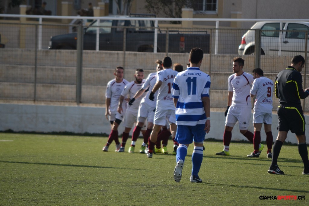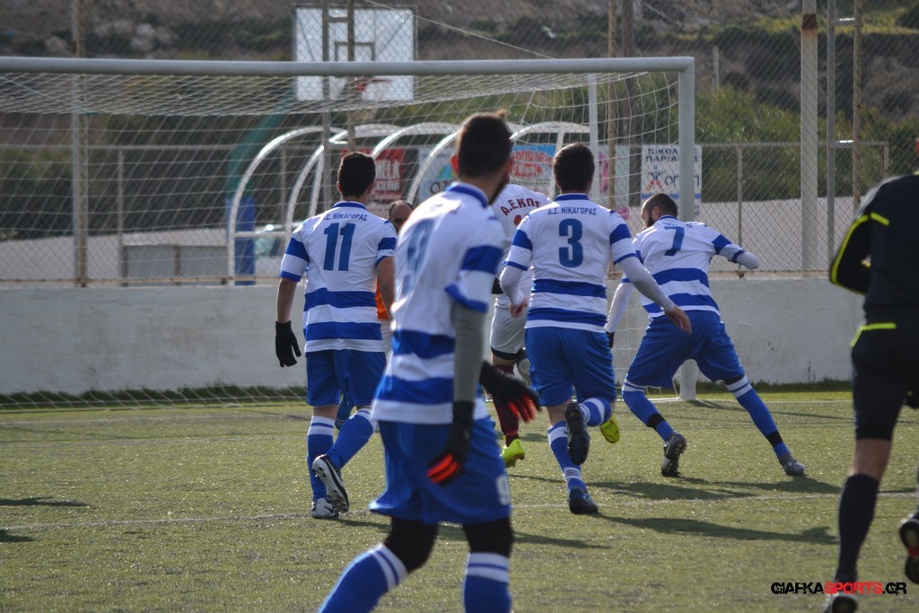 Μία εβδομάδα μετά την ήττα στην Καρδάμαινα ο Νικαγόρας υποχρέωσε σε βαριά ήττα την Α.Ε Κω (4-3) , την κράτησε 5 βαθμούς μακριά από την κορυφή δίνοντας παράλληλα δώρο στην Δόξα Καρδάμαινας (αν κερδίσει αύριο την Αναγέννηση στο Ζηπάρι) να ξεφύγει με 8 βαθμούς και να κάνει το πιο αποφασιστικό βήμα για τον τίτλο. Οι γηπεδούχοι παρόλο που αγωνίστηκαν χωρίς κανονικό τερματοφύλακα (Διακοδημητρίου και Δραμουντανής ήταν εκτός νησιού και έπαιξε κατ’ ανάγκη ο Διακογιάννης) ήταν ανώτεροι στην μεγαλύτερη διάρκεια του παιχνιδιού και επικράτησαν με 4-3. Φούσκας, Σκευοφύλαξ Ε., Ζερβός Ν., Κοκκαλάκης Γ. τα γκολ του Νικαγόρα ενώ για την Α.Ε Κω που έπαιζε από το 40’ με δέκα παίχτες (δεύτερη κίτρινη ο Κιολές) είχε ισοφαρίσει προσωρινά ο Κώστογλου με τον Ζαίμι με δύο γκολ στο τέλος να μειώνει σε 4-3.