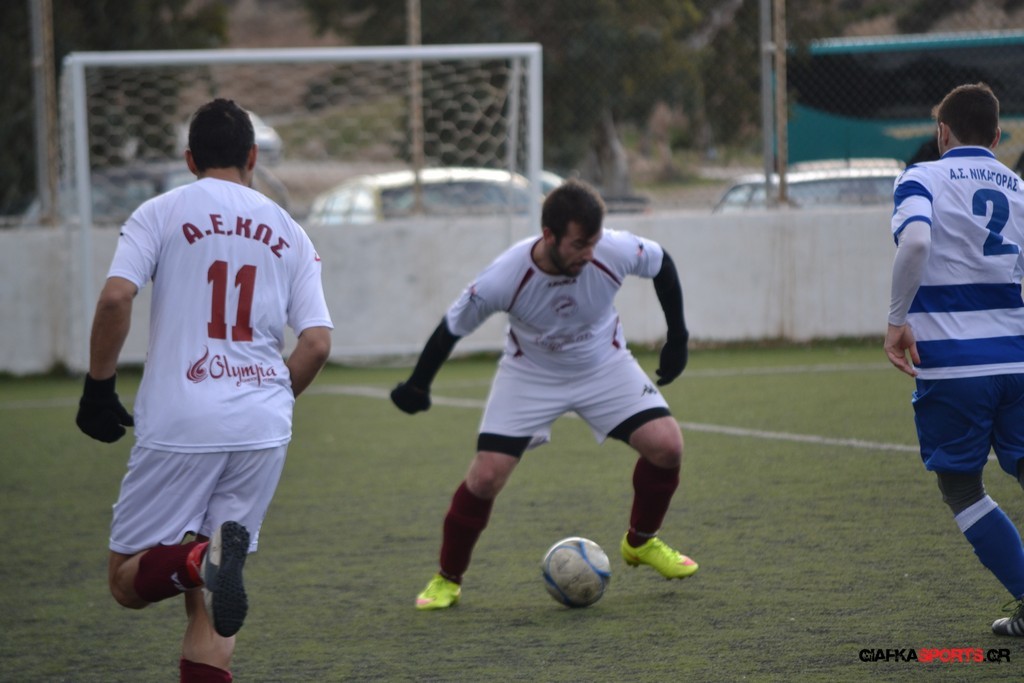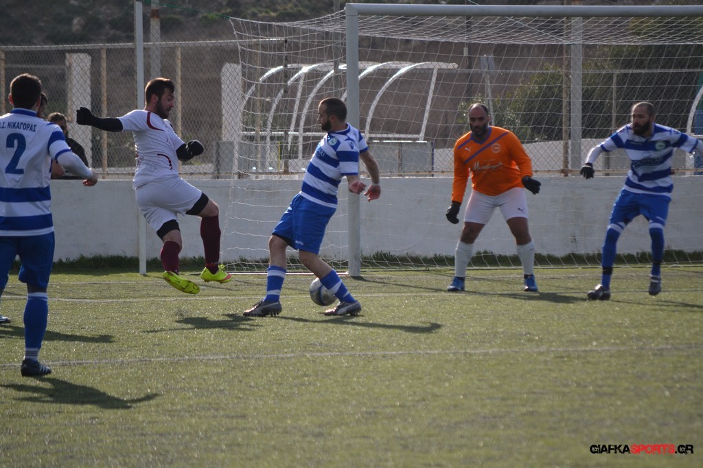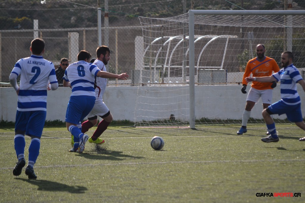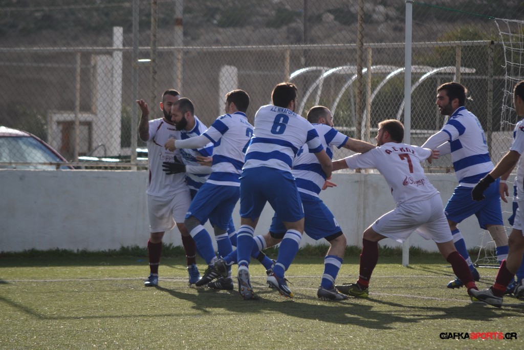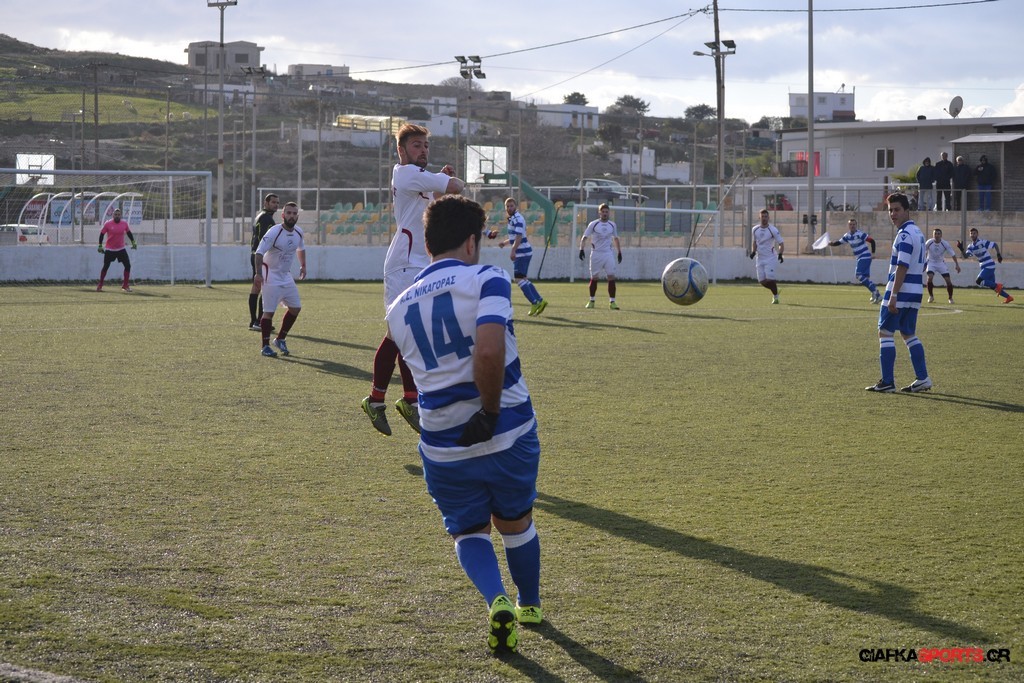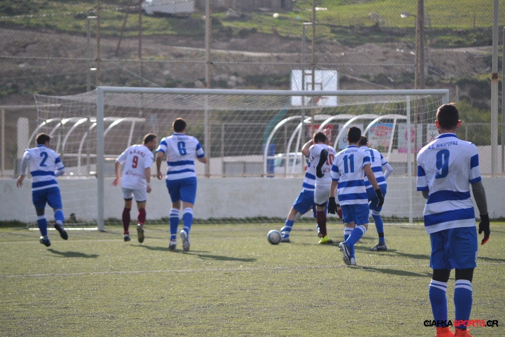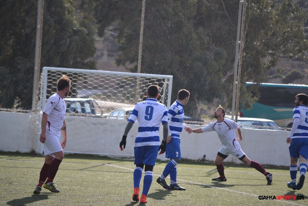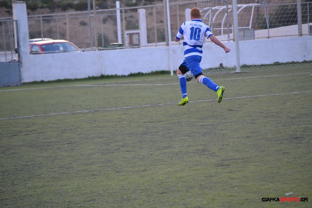 Μία εβδομάδα μετά την ήττα στην Καρδάμαινα ο Νικαγόρας υποχρέωσε σε βαριά ήττα την Α.Ε Κω (4-3) , την κράτησε 5 βαθμούς μακριά από την κορυφή δίνοντας παράλληλα δώρο στην Δόξα Καρδάμαινας (αν κερδίσει αύριο την Αναγέννηση στο Ζηπάρι) να ξεφύγει με 8 βαθμούς και να κάνει το πιο αποφασιστικό βήμα για τον τίτλο. Οι γηπεδούχοι παρόλο που αγωνίστηκαν χωρίς κανονικό τερματοφύλακα (Διακοδημητρίου και Δραμουντανής ήταν εκτός νησιού και έπαιξε κατ’ ανάγκη ο Διακογιάννης) ήταν ανώτεροι στην μεγαλύτερη διάρκεια του παιχνιδιού και επικράτησαν με 4-3. Φούσκας, Σκευοφύλαξ Ε., Ζερβός Ν., Κοκκαλάκης Γ. τα γκολ του Νικαγόρα ενώ για την Α.Ε Κω που έπαιζε από το 40’ με δέκα παίχτες (δεύτερη κίτρινη ο Κιολές) είχε ισοφαρίσει προσωρινά ο Κώστογλου με τον Ζαίμι με δύο γκολ στο τέλος να μειώνει σε 4-3.