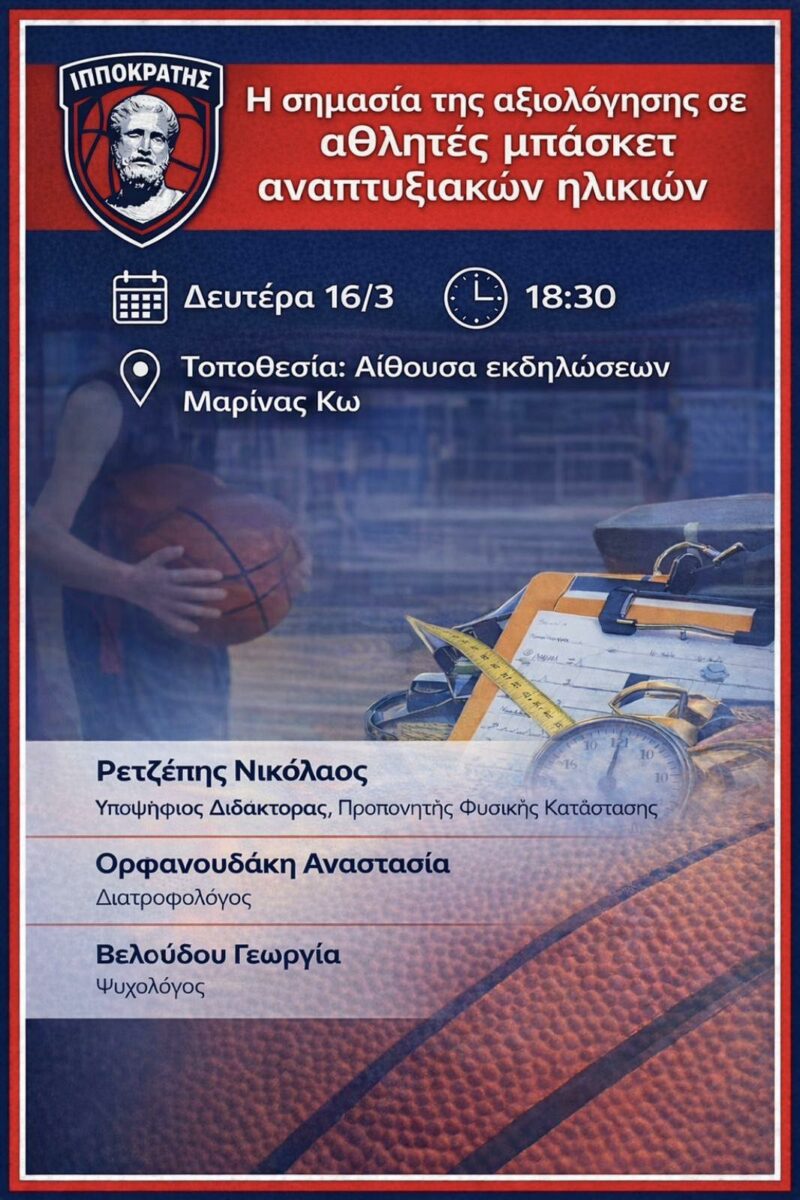 Ο Νικόλαος Ρετζέπης, κάτοχος δύο μεταπτυχιακών τίτλων και υποψήφιος Διδάκτωρ στο Δημοκρίτειο Πανεπιστήμιο, Σχολή Φυσικής αγωγής και αθλητισμού μέλος της προπονητικής ομάδας του ανδρικού και του γυναικείου μας τμήματος και προπονητής της Ακαδημίας μας σε συνεργασία με τη Γεωργία Βελούδου, ψυχολόγο συνεργαζόμενη με το ΚΕΔΑΣΥ, αθλήτρια της γυναικείας μας ομάδας και προπονήτρια της Ακαδημίας μας και την Αναστασία Ορφανουδάκη διατροφολόγος με τεράστια εμπειρία σε περιπτώσεις διατροφικών δυσλειτουργιών σε παιδιά και εφήβους, θα αναλύσουν τη σημασία της επιστημονικής, τακτικής και στοχευμένης αξιολόγησης των αθλούμενων παιδιών, με βασικό κριτήριο τα στάδια βιολογικής ωρίμανσης. Θα παρουσιαστεί στατιστικό δείγμα ανά ηλικιακή κατηγορία μετά από τις μετρήσεις που πραγματοποιήθηκαν υπό την επίβλεψη και προγραμματισμό του κου Ρετζέπη στην Ακαδημία Καλαθοσφαίρισης του Ιπποκράτη, σε παιδιά ηλικίας από 5 – 15 ετών. Η εκδήλωση απευθύνεται σε γονείς ,αθλητές, παράγοντες σωματείων και προπονητές αναπτυξιακών ηλικιών κάθε αθλήματος και όλων των αθλητικών συλλόγων.