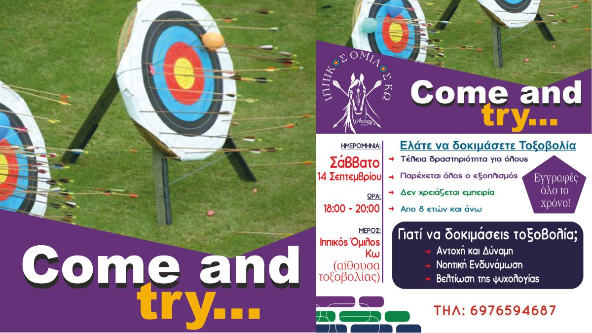 Δώστε μία ευκαιρία στον εαυτό σας να γνωρίσει αυτό το τόσο όμορφο άθλημα της τοξοβολίας ! Εγγραφές όλο τον χρόνο! Διαδώστε το ελευθέρα!