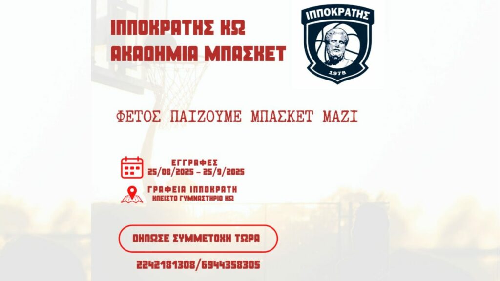 Η ακαδημία μπάσκετ του Ιπποκράτη ξεκινά τη νέα αγωνιστική χρονιά, ανοίγοντας τις εγγραφές από 25 Αυγούστου έως 25 Σεπτεμβρίου 2025. Με σύνθημα «Φέτος παίζουμε μπάσκετ μαζί», ο σύλλογος καλεί μικρούς και μεγάλους αθλητές να ζήσουν τη χαρά του αθλήματος μέσα από σωστή καθοδήγηση, ομαδικότητα και αγάπη για το μπάσκετ.