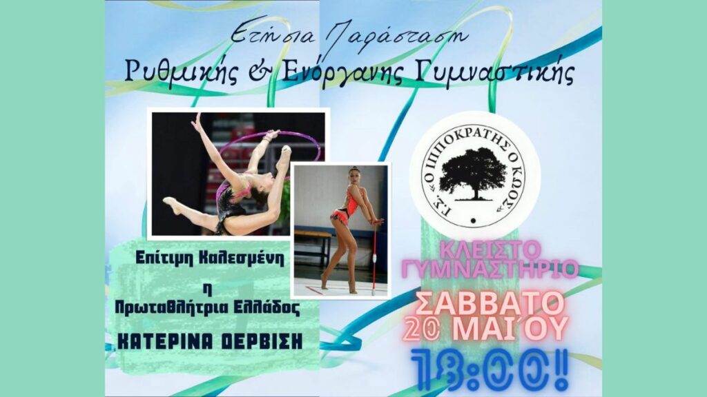 20 Μαΐου θα πραγματοποιηθεί η ετήσια παράσταση ρυθμικής και ενόργανης γυμναστικής στο Κλειστό γυμναστήριο Κω απ’ τον Ιπποκράτη τον Κώο στις 18:00.