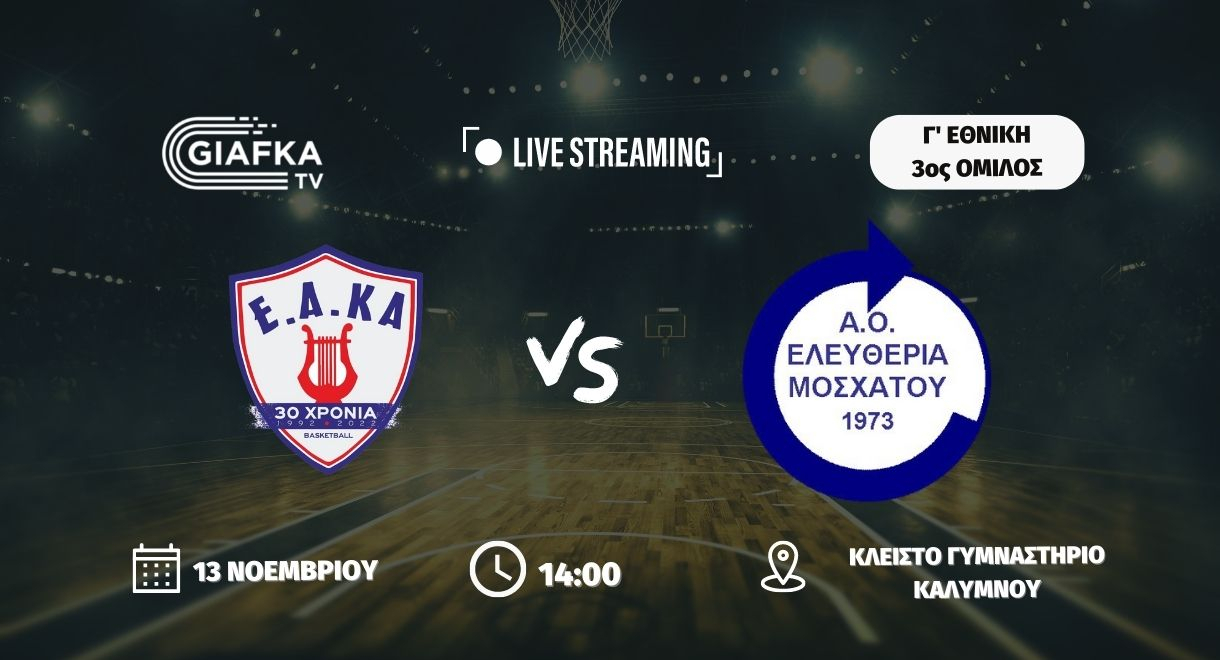 Παρακολουθήστε την Κυριακή 13 Νοεμβρίου στις 14:00 σε Live Streaming απ’ το giafkasports.gr την αναμέτρηση για την 6η αγωνιστική της Γ’ Εθνικής (3ος Όμιλος) ανάμεσα σε Ε.Α.ΚΑ και Ελευθερία Μοσχάτου.
