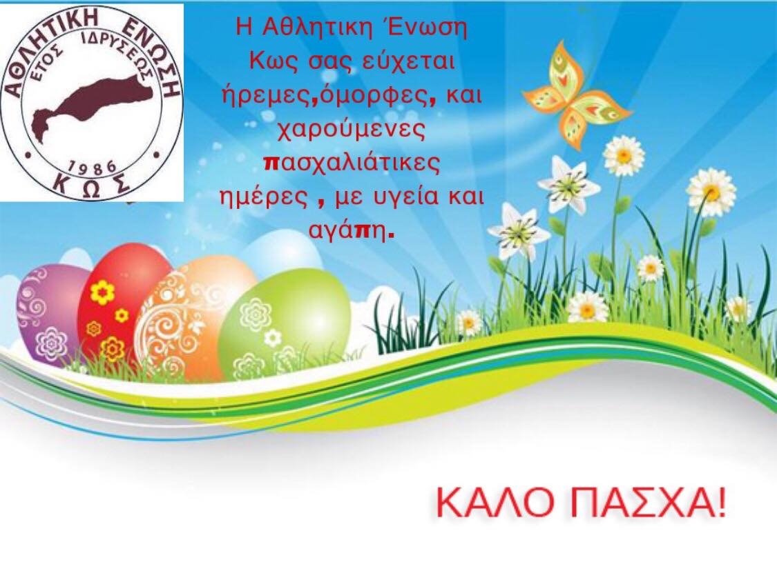 Η Αθλητική Ένωση Κω σας εύχεται ήρεμες, όμορφες και χαρούμενες Πασχαλιάτικες ημέρες, με υγεία και αγάπη.