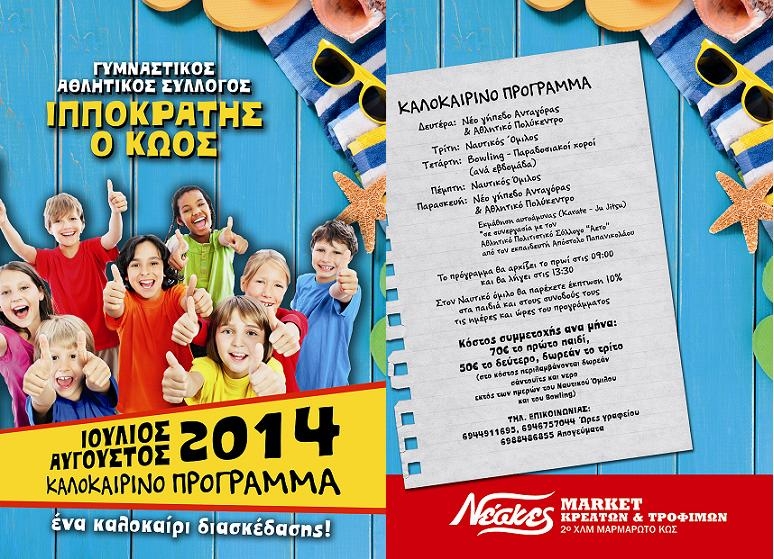 Ο Γ.Σ ΙΠΠΟΚΡΑΤΗΣ Ο ΚΩΟΣ στο πρώτο καλοκαίρι λειτουργίας του θέλει να δώσει χαρά και θετική ενέργεια και παράλληλα διασκέδαση στα παιδιά σας στο καλοκαιρινό καμπ που διοργανώνει από 1/7/2014 έως και 31/08/2014.Για περισσότερες πληροφορίες και δηλώσεις συμμετοχών επικοινωνήστε στα παρακάτω τηλέφωνα.