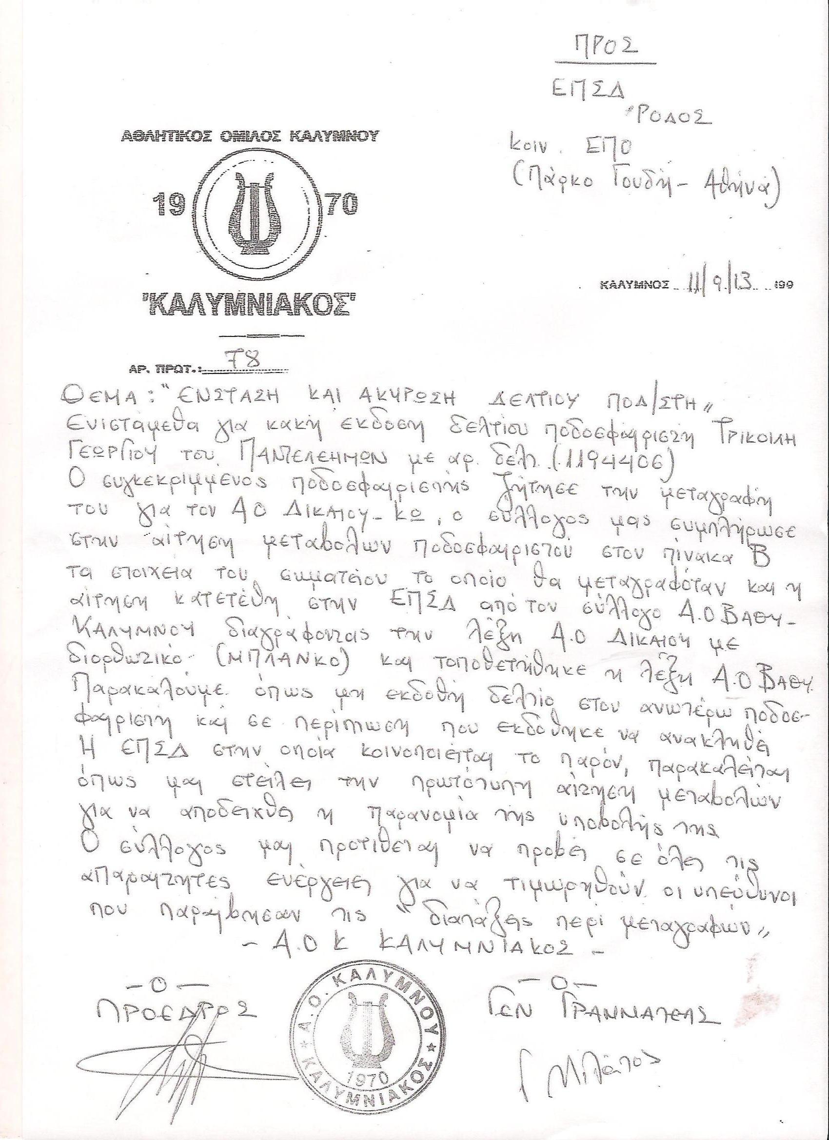 Ο συγκεκριμένος ποδοσφαιριστής ζήτησε την μεταγραφή του για τον Α.Ο Δικαίου-Κω, ο σύλλογος μας συμπλήρωσε στη αίτηση μεταβολών ποδοσφαιριστού στον πίνακα Β’ τα στοιχεία του σωματείου το οποίο θα μεταγραφόταν και η αίτηση κατατέθη στην ΕΠΣΔ απ’ τον σύλλογο Α.Ο Βαθύ Καλύμνου διαγράφοντας τη λέξη Α.Ο Δικαίου με διορθωτικό (μπλάνκο) και τοποθετήθηκε η λέξη Α.Ο Βαθύ.