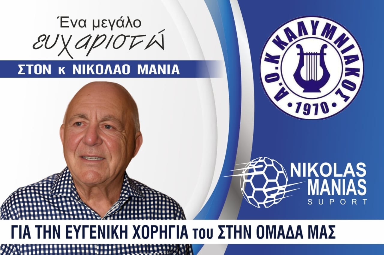 Ανακοίνωση εξέδωσε ο Καλυμνιακός με την οποία ευχαρίστησε το Νικόλαο Μανιά για την χορηγία του αθλητικού υλικού στον σύλλογο.