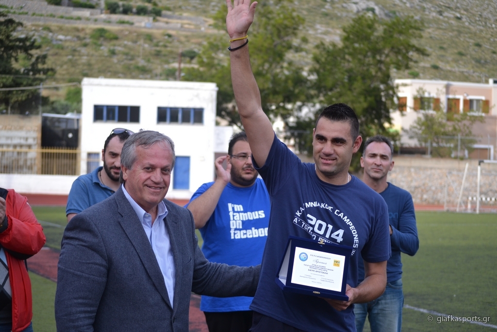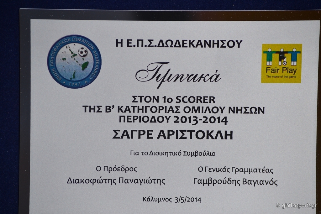 Μετά το τέλος του φιλικού ακολούθησε η απονομή όπως γίνεται στην Primera Division με τους ποδοσφαιριστές της μικτής να έχουν ανοίξει διάδρομο για να περνούν ανάμεσα τους οι παίκτες του Καλυμνιακού ενώ η ΕΠΣ Δωδεκανήσου παρέδωσε και μια πλακέτα στον Άρη Σαγρέ για τον τίτλο του πρώτου σκόρερ που μοιράζεται με τον Δημήτρη Πη.