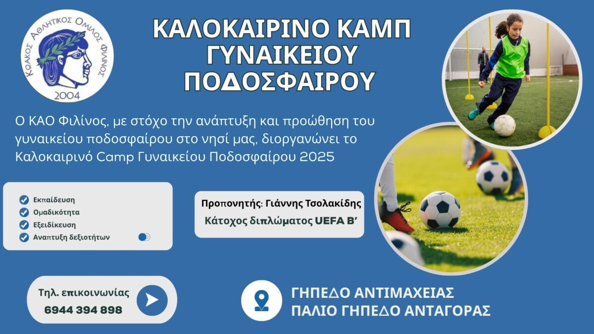 Ο ΚΑΟ Φιλίνος, με στόχο την ανάπτυξη και προώθηση του γυναικείου ποδοσφαίρου στο νησί μας, διοργανώνει το Καλοκαιρινό Camp Γυναικείου Ποδοσφαίρου 2025, προσφέροντας στα κορίτσια την ευκαιρία να μάθουν, να διασκεδάσουν και να εξελιχθούν μέσα από την προπόνηση και το ομαδικό πνεύμα. Το camp απευθύνεται σε νέες αθλήτριες που αγαπούν το άθλημα και θέλουν να κάνουν τα πρώτα τους βήματα ή να βελτιώσουν τις δεξιότητές τους με καθοδήγηση από εξειδικευμένο προπονητή.