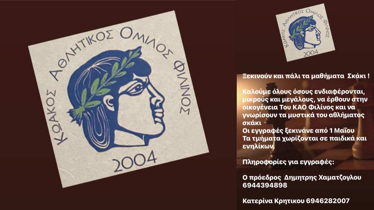 Ανακοίνωση εξέδωσε ο ΚΑΟ Φιλίνος κάνοντας γνωστό ότι ξεκινούν οι εγγραφές για τα τμήματα του σκάκι απ’ την 1η Μαΐου.