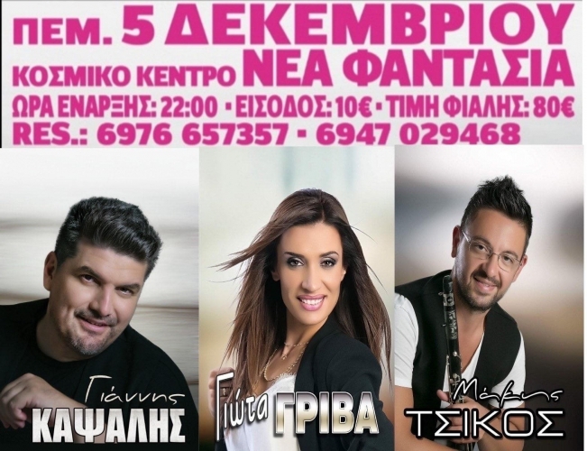 Ο Γ. Καψάλης, η  Γ. Γρίβα και ο Μ. Τσίκος για πρώτη φορά στην Κω υπόσχονται μία αξέχαστη βραδιά. Έρχονται για πρώτη φορά στο νησί μας την Πέμπτη 5 Δεκεμβρίου στην ΝΕΑ ΦΑΝΤΑΣΙΑ.