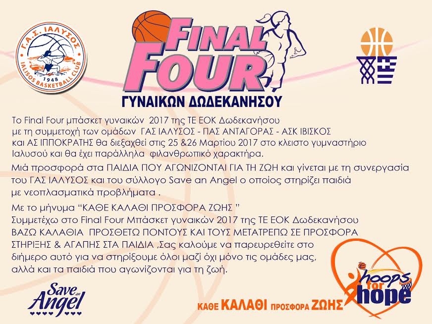 Το φάιναλ-φορ μπάσκετ γυναικών 2017 της Τ.Ε. Ε.Ο.Κ. Δωδεκανήσου με τη συμμετοχή των ομάδων, Γ.Α.Σ. Ιάλυσος, Π.Α.Σ. Ανταγόρας, Α.Σ.Κ. Ιβίσκος και Α.Σ. Ιπποκράτης θα διεξαχθεί στις 25 και 26 Μαρτίου 2017 στο κλειστό γυμναστήριο Ιαλυσού και θα έχει παράλληλα φιλανθρωπικό χαρακτήρα. Μία προσφορά στα ΠΑΙΔΙΑ ΠΟΥ ΑΓΩΝΙΖΟΝΤΑΙ ΓΙΑ ΤΗ ΖΩΗ και γίνεται με τη συνεργασία του Γ.Α.Σ. ΙΑΛΥΣΟΣ και του συλλόγου SAVE AN ANGEL, ο οποίος στηρίζει παιδιά με νεοπλασματικά προβλήματα. Με το μήνυμα «ΚΑΘΕ ΚΑΛΑΘΙ ΠΡΟΣΦΟΡΑ ΖΩΗΣ», συμμετέχω στο φάιναλ-φορ μπάσκετ γυναικών 2017 της Τ.Ε. Ε.Ο.Κ. Δωδεκανήσου. Βάζω καλάθια, προσθέτω πόντους και τους μετατρέπω σε προσφορά στήριξης και αγάπης στα παιδιά. Σας καλούμε να παρευρεθείτε στο διήμερο αυτό για να στηρίξουμε όλοι μαζί όχι μόνο τις ομάδες μας αλλά και τα παιδιά που αγωνίζονται για τη ζωή».