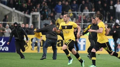 Εικόνες ντροπής στο ΟΑΚΑ από ανεγκέφαλη μερίδα οπαδών της ΑΕΚ που μόλις ο Μαυρουδής Μπουγαΐδης στο 87′ με αυτογκόλ έβαλε μπροστά στο σκορ τον Πανθρακικό, εισέβαλε στον αγωνιστικό χώρο θέλοντας να κάνει επίθεση στους πάντες. Το παιχνίδι διακόπηκε, με την ΑΕΚ να βρίσκεται με το ένα πόδι στη Football League.